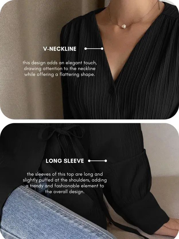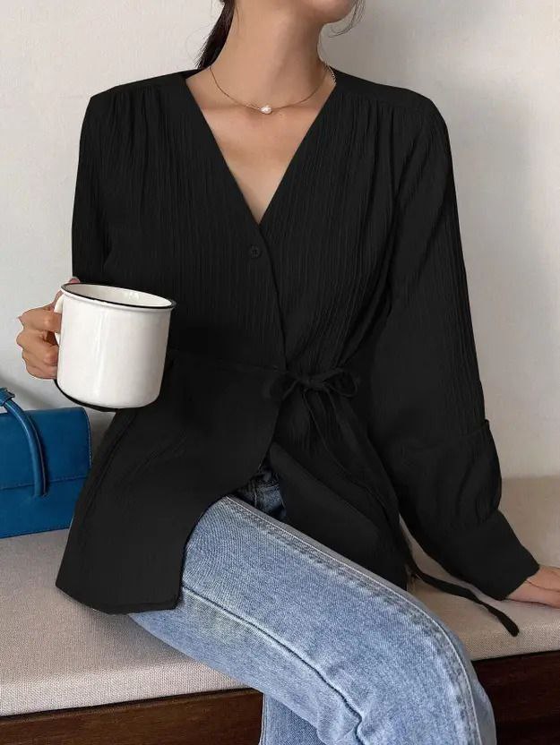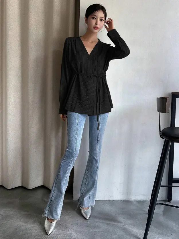 Elevate your casual chic wardrobe with this stylish black textured top. This piece is designed with a flattering V-neckline and long sleeves, featuring a subtle textured or pleated finish for added visual interest and dimension. The key design element is the adjustable tie waist, which cinches the top, creating a beautiful peplum effect and a customized, figure-defining silhouette. The slight high-low hem adds a modern touch. Versatile and easy to style, this top transitions effortlessly from the office to an evening out. As shown, pair it with flared denim jeans and metallic heels for a sophisticated, contemporary look. It’s an essential piece for building an elegant, timeless ensemble with minimal effort.