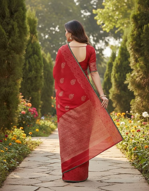 This saree, shown in a back view, features a vibrant, festive True Red color. The material appears to be a Woven Silk or Silk Blend, giving it a structured yet soft drape. The main body of the saree has scattered gold Buta (small motif) work. The reverse side of the pallu clearly shows heavy, detailed Gold Zari weaving in a traditional motif, indicating a rich, opulent texture. The saree is finished with a thin contrast Green piping or border, adding a pop of color to the edge. The matching red blouse has a simple elbow-length sleeve. This classic, auspicious red saree is perfect for traditional events, especially for the bride’s immediate family or major cultural festivals.