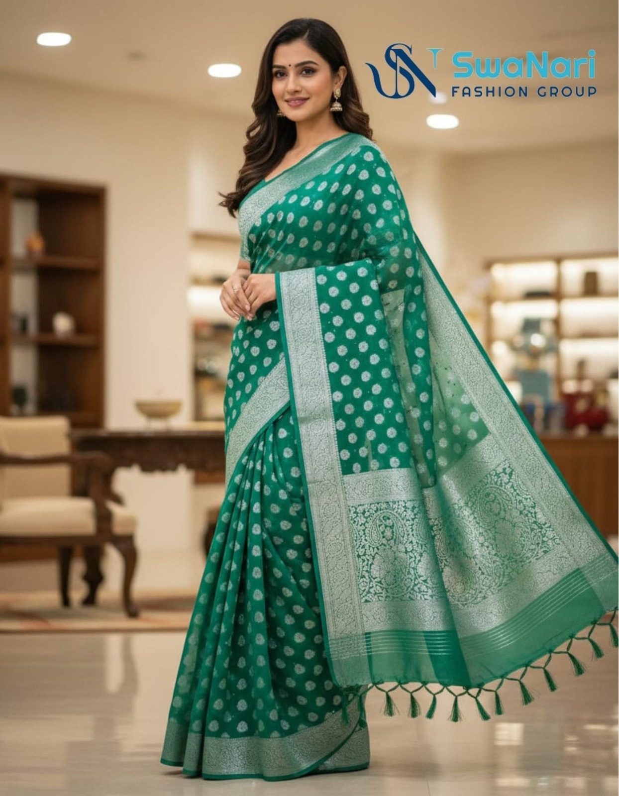 | Saree Pattern: | All-Over Woven Dot/Circular Motifs (Butis) with Monochromatic Woven Border and Pallu |