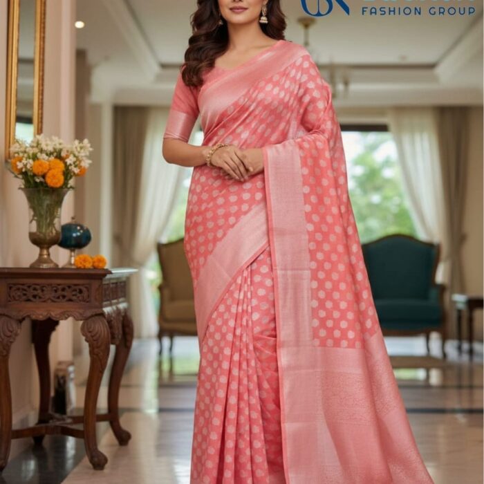 Radiate soft elegance with this exquisite saree woven from a luxurious Art Silk/Blended Silk fabric, offering a rich texture and graceful drape. The beautiful Coral Pink/Peach hue provides a stunning backdrop for the all-over woven dot motifs (butis), creating a sophisticated, textured shimmer. The design is elegantly framed by a wide, monochromatic woven border and pallu, highlighting the subtle craftsmanship. This timeless piece is the ideal choice for festive occasions, day weddings, and semi-formal events, offering a blend of traditional appeal and delicate modern color.