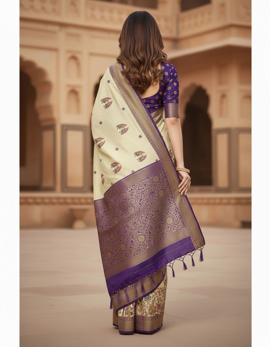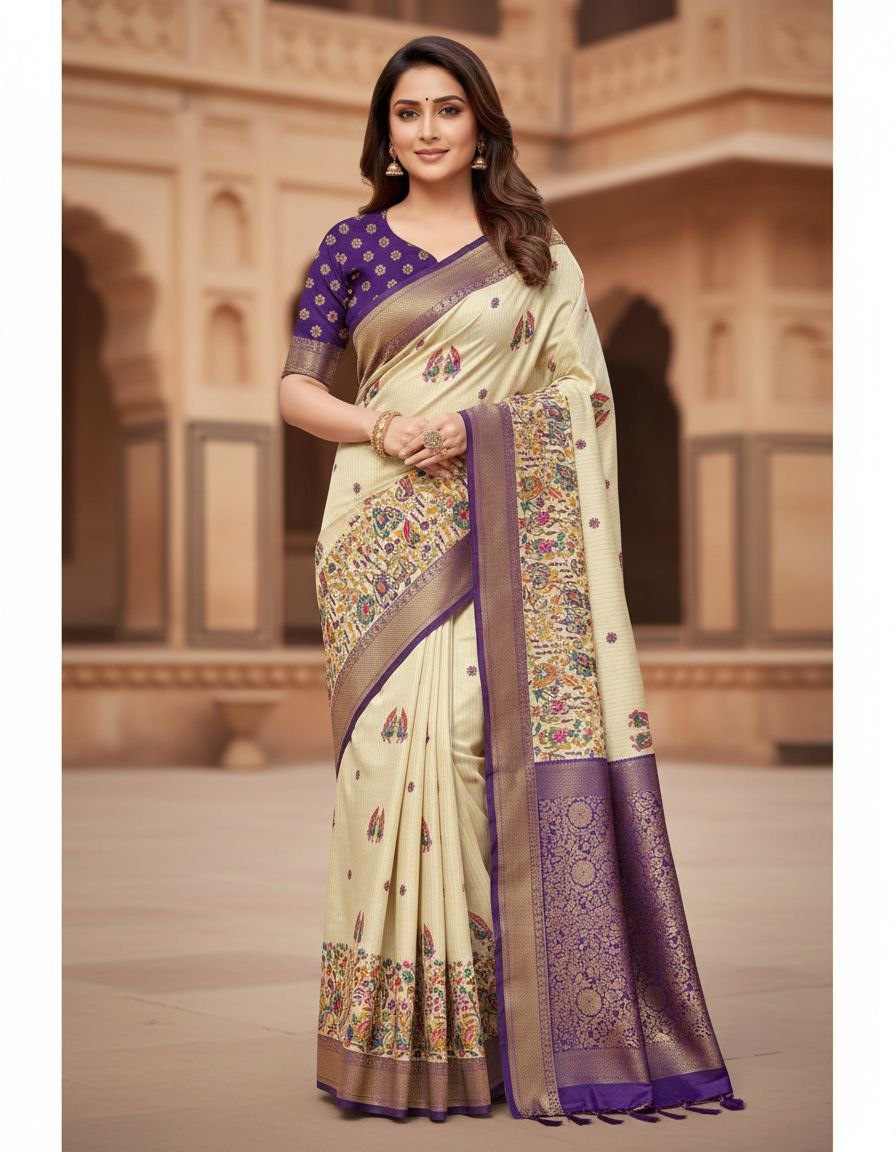 The saree is accompanied by a contrasting purple blouse, beautifully embellished with golden floral bootis and a matching woven border. The lightweight yet lustrous fabric ensures a graceful silhouette and comfort throughout long events. Whether it’s a high-profile wedding, a festive celebration, or a formal gathering, this saree is designed to make you feel like royalty. Its unique color palette of cream and deep purple offers a refreshing break from traditional reds and greens, making it a sophisticated choice for the discerning woman.