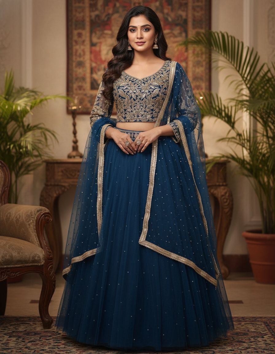 Exude regal charm in this stunning Deep Blue Net Lehenga Choli. The rich, dark blue/teal hue provides a luxurious backdrop for the dazzling gold work. The voluminous net skirt features delicate, scattered gold sequins that shimmer subtly. The centerpiece is the long-sleeved choli, which is a work of art, completely covered in dense Gold Zari and Thread Embroidery in beautiful floral and vine motifs. Paired with a matching net dupatta finished with a bold gold border, this ensemble strikes a perfect balance between traditional heavy work and sophisticated color, making it an exquisite choice for evening celebrations.