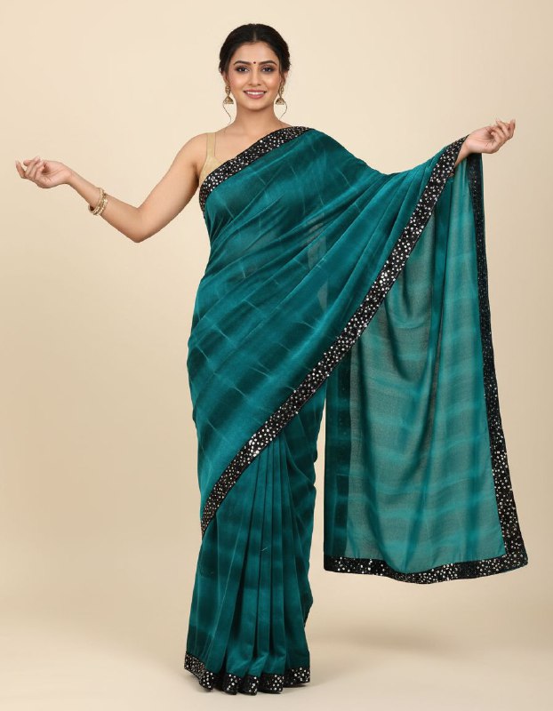This eye-catching saree boasts a vibrant, deep shades of blue color palette with a striking, abstract tie-dye or shaded effect throughout the fabric, likely a georgette or lightweight art silk. The dynamic coloring gives the illusion of movement. The edge of the saree is beautifully highlighted by a contrasting black border heavily embellished with sequin or black stone work, creating a dazzling, festive finish. It is paired with a plain black sleeveless blouse (implied), which allows the saree’s vivid color and shimmering border to take center stage. This saree is perfect for cocktail parties, festive evenings, and contemporary social events.