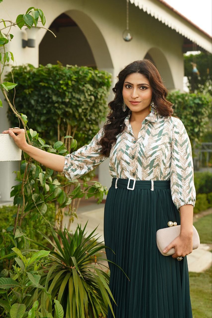 Presenting a polished and modern ensemble, this set pairs a uniquely patterned shirt with a fluid pleated skirt. The white button-down shirt features an abstract zigzag print in a sophisticated palette of deep moss green and beige/olive, giving it a nature-inspired yet contemporary feel. The shirt has a smart collar, a buttoned placket, and comfortable three-quarter sleeves. It is stylishly tucked into a high-waisted, deep emerald green pleated maxi skirt. The fine pleats create beautiful vertical lines and movement, adding texture and drama to the look. The outfit is cinched with a matching green belt with a prominent white square buckle, defining the waistline. Perfect for office wear, upscale social events, or semi-formal gatherings, this co-ord set offers a refined and fashionable silhouette, easily accessorized with statement earrings and a pale clutch.