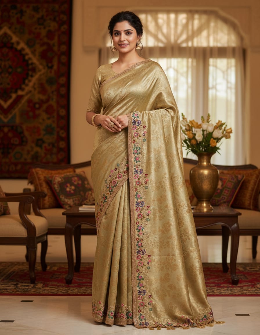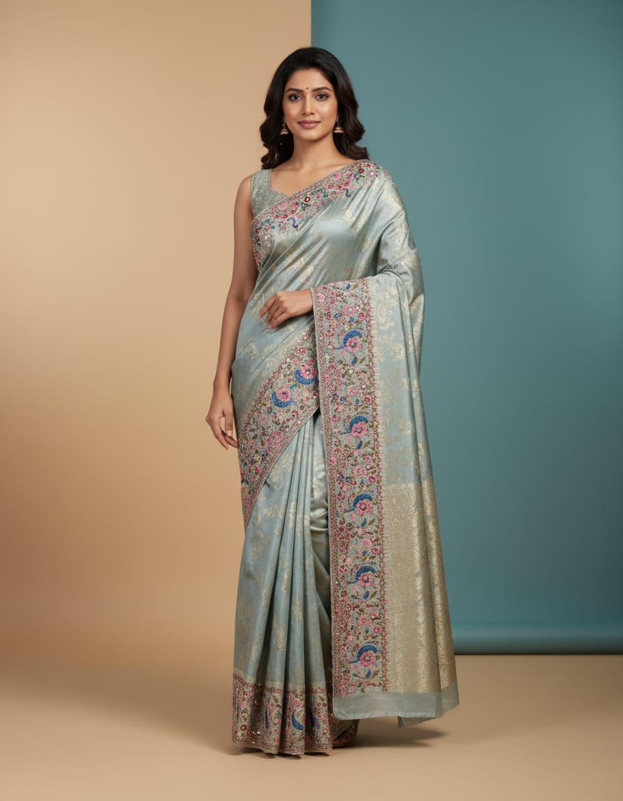 Saree Pattern: Intricate Floral Thread and Silver Zari Embroidery (Jaal/Cut-work Border)