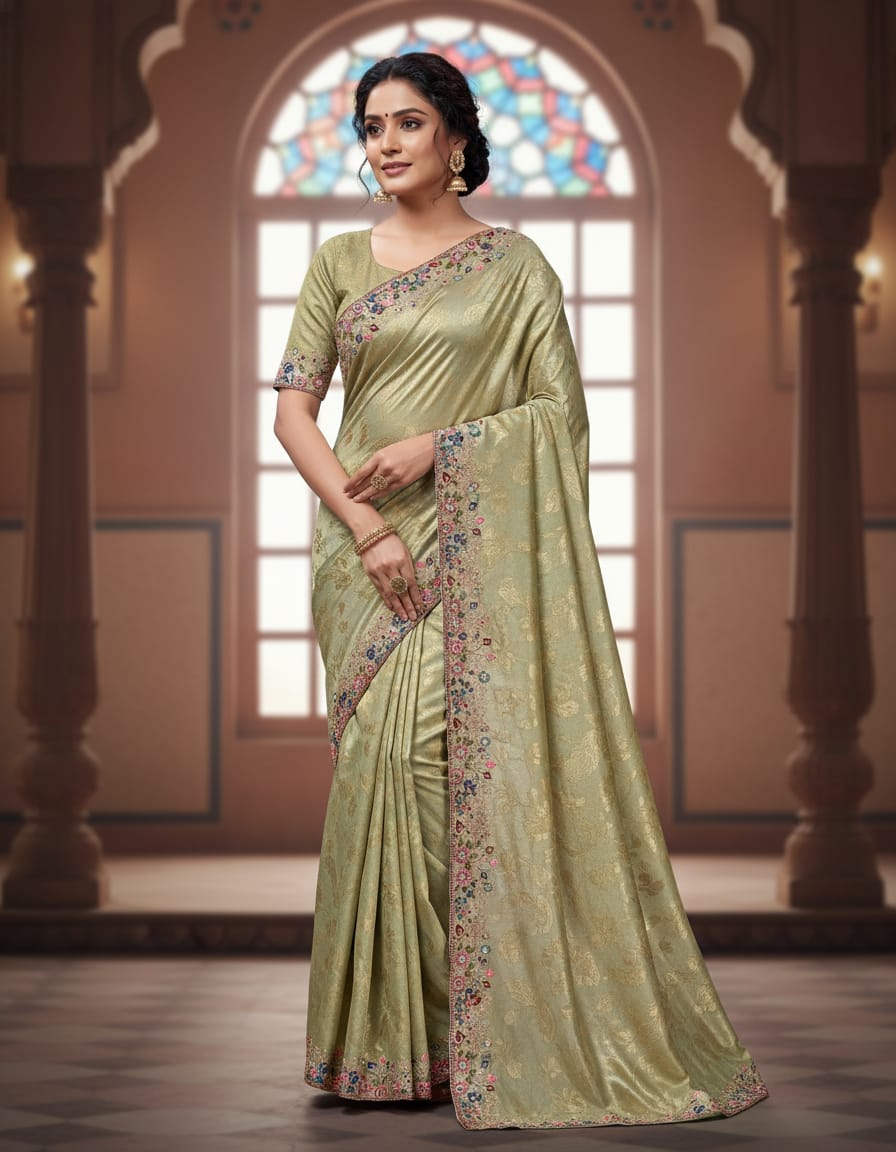 The accompanying Blouse Material is a matching Lavender or a complementary solid color, often featuring heavy embroidery on the sleeves or back to balance the saree’s detail. This is an ideal piece for evening receptions, parties, or formal sangeet ceremonies where a lighter drape is desired.