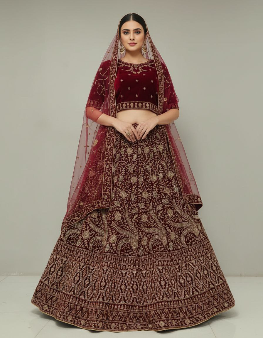 Elegant Maroon Velvet Bridal Lehenga