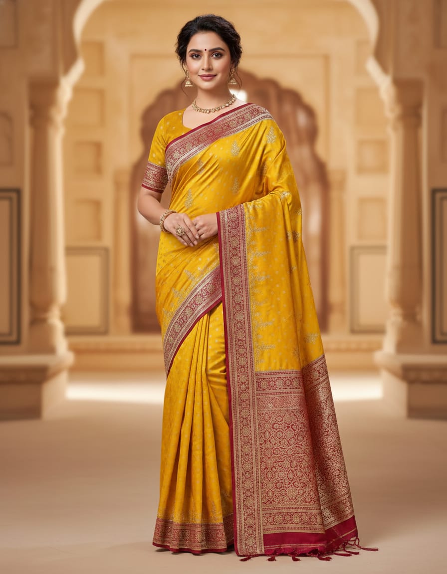 This saree is a picture of classic grace, combining a vibrant base color with traditional contrast borders. The material is a lustrous Silk (likely an Art Silk or a lighter Banarasi/Kanjivaram Silk variant) that drapes beautifully and has a subtle sheen. The main Saree Color is a cheerful Mustard Yellow or Deep Haldi Yellow.