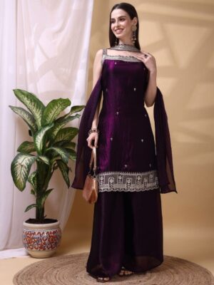 Celebrate vibrant ethnic aesthetics with this stunning three-piece suit set in a rich Rani Pink hue. This ensemble strikes a perfect balance between traditional craftsmanship and modern silhouettes, making it an ideal choice for festive gatherings, pre-wedding ceremonies, or elegant evening soirees.
