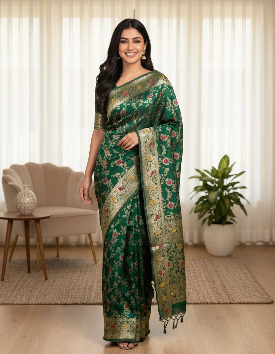 Exude timeless grace with this stunning Emerald Green Banarasi Silk Saree, a masterpiece that marries traditional craftsmanship with contemporary sophistication. This saree is meticulously woven from premium silk, offering a rich, lustrous texture that drapes fluidly to accentuate the silhouette. The deep emerald hue serves as a regal canvas for the intricate Zari work, featuring delicate floral motifs interspersed with hints of pink and mustard yellow, adding a vibrant pop of color to the classic design.