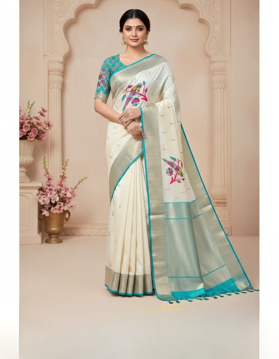 The drape is framed by a majestic Zari border, available in two distinct royal tones: a shimmering Teal Blue and a regal Deep Rose. Each border is intricately woven with traditional patterns that catch the light, providing a high-contrast finish to the cream canvas. Accompanied by a coordinating designer blouse—featuring either a rich teal floral pattern or a matching deep rose embroidery—this saree is designed for the woman who appreciates timeless heritage. Whether it’s a high-profile wedding, a grand festive celebration, or an elegant evening reception, this collection ensures you remain the personification of poise and class.