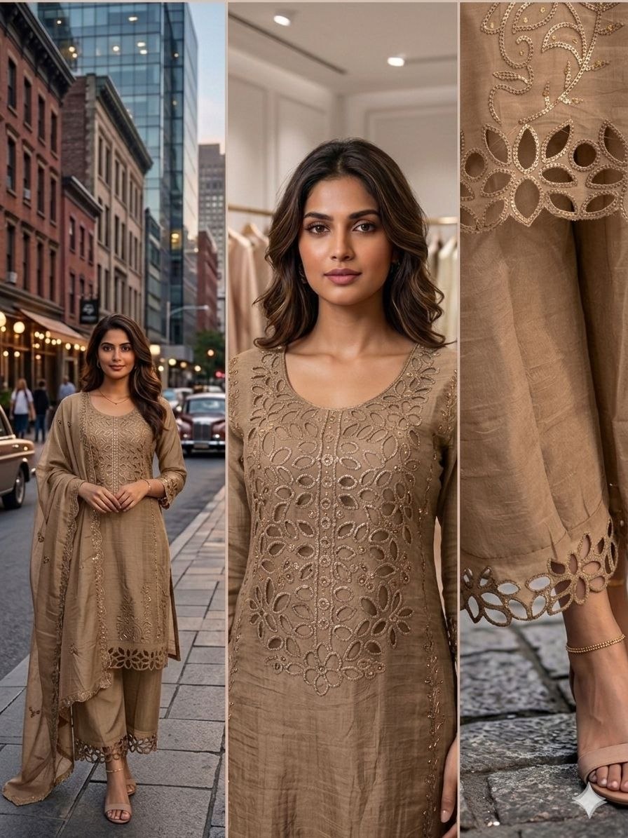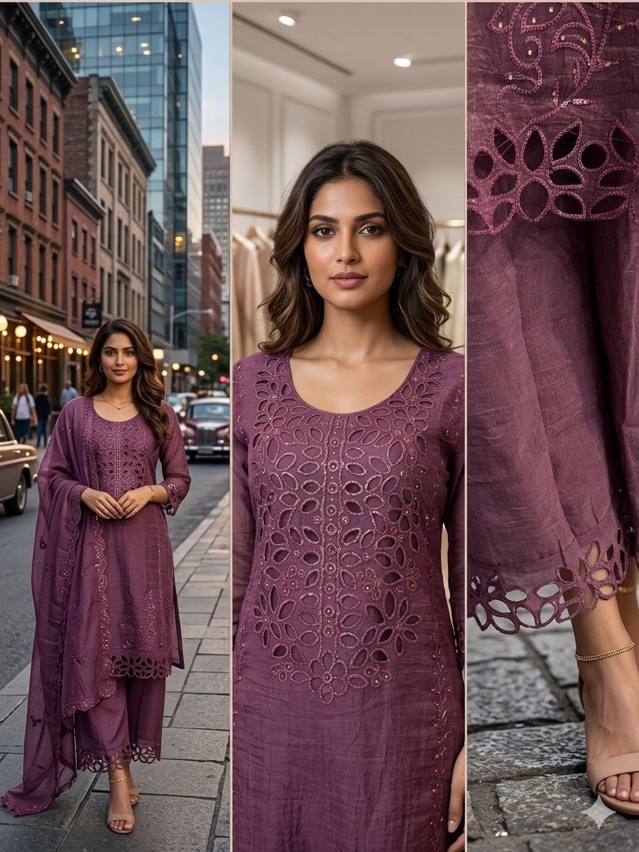 Experience the epitome of artisanal luxury with our Cut-Work Chanderi Silk Suit Set. This ensemble is designed for the woman who seeks a sophisticated edge in her ethnic wardrobe. Crafted from high-grade Chanderi Silk, the fabric features a beautiful, subtle slub texture that provides a rich, tactile feel while maintaining a lightweight and airy silhouette.