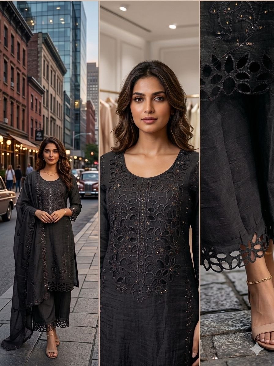 Paired with a sheer, flowing dupatta adorned with a sequined embroidery border, this set is a masterpiece of tonal design. Whether you choose the regal Plum, the classic Carbon Black, or the sophisticated Antique Gold, this suit set is guaranteed to make a lasting impression at weddings, soirées, or formal festive gatherings.