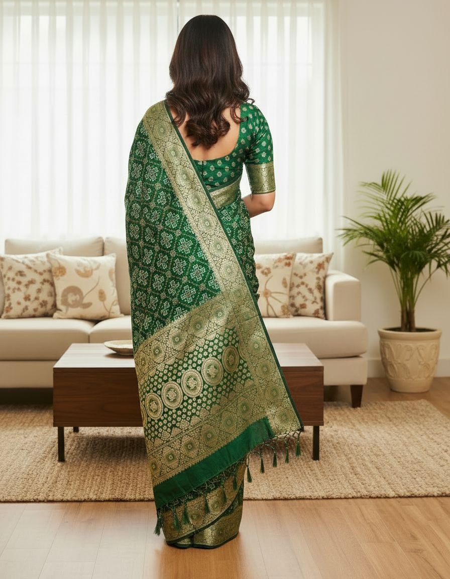The saree features a classic Geometric Patola or Bandhani print, meticulously integrated with a heavy Gold Zari border that adds a touch of regal opulence. Its intricate patterns make it an ideal choice for grand celebrations, including weddings, festive occasions like Diwali or Karwa Chauth, and formal gatherings. Measuring 5.5 meters in length, it provides ample fabric for graceful pleating and a traditional silhouette.