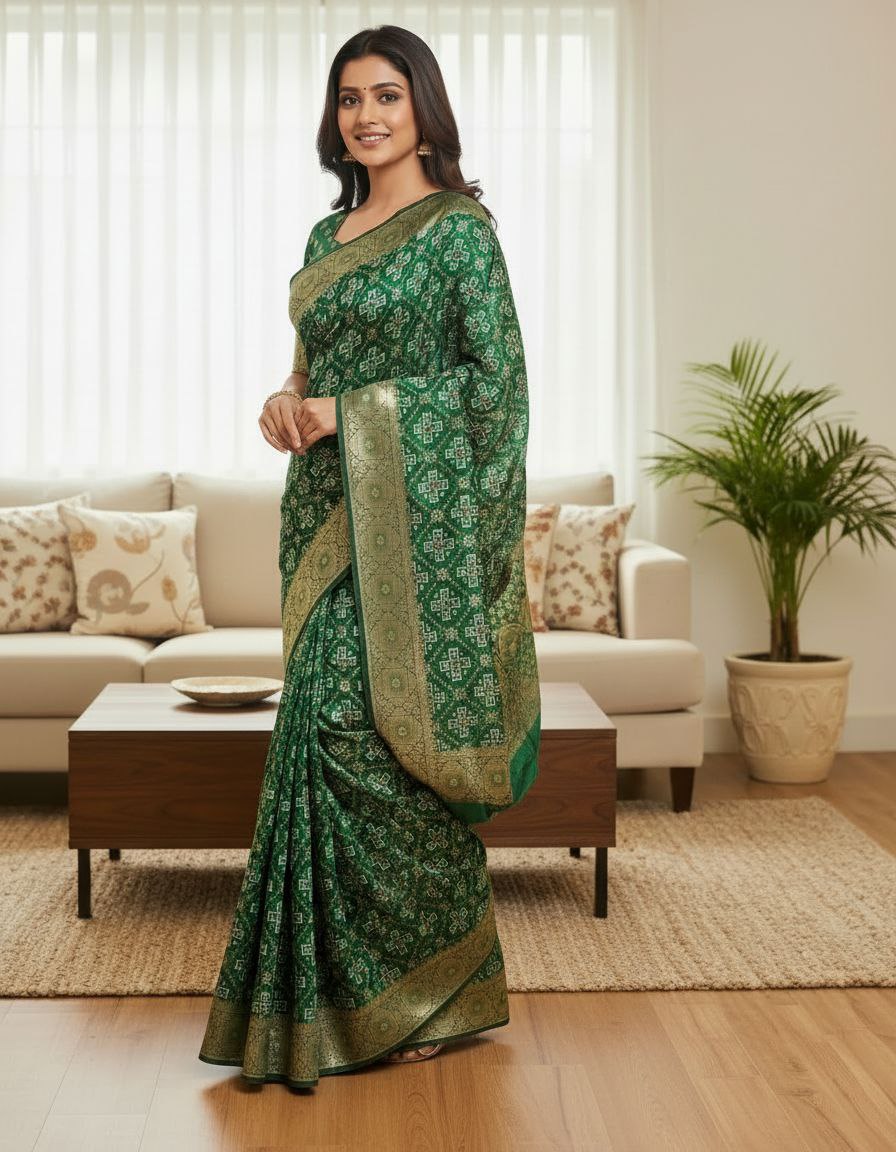 | Saree Pattern | Geometric Patola / Bandhani print with heavy Zari border |