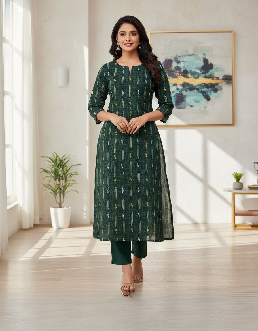 Step into effortless elegance with our Forest Green Straight Kurta Set, a perfect blend of traditional artistry and modern tailoring. This ensemble features a deep, earthy green base adorned with sophisticated vertical ikat-inspired patterns and delicate floral motifs. The vertical design elements work to create a sleek, elongated silhouette, making it as flattering as it is stylish.
