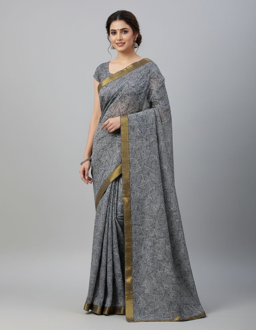 This contemporary saree features a sophisticated light to medium grey color in a sheer, flowing fabric like georgette or chiffon. The body is covered in an all-over white geometric print, composed of intersecting lines and triangles, creating a modern, abstract look. The elegant design is framed by a narrow yet distinct gold zari border with a thin black stripe, adding a traditional touch of contrast. It is paired with a matching solid grey blouse (implied in the image) with short sleeves and a simple round neck. This stylish saree is highly versatile, perfect for office wear, cocktail events, or modern semi-formal gatherings.