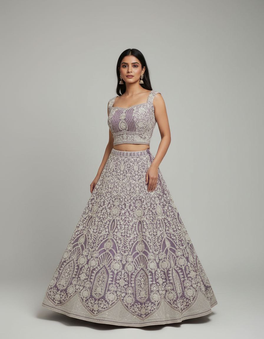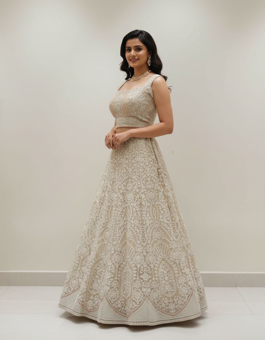 | Choli | Fabric: Net base with lining. Design: Sleeveless, square/V-neck, cropped blouse. Heavily adorned with dense White/Silver Sequin and Zari Work, matching the skirt’s overall aesthetic. Features a prominent pearl/beaded fringe along the hem. |