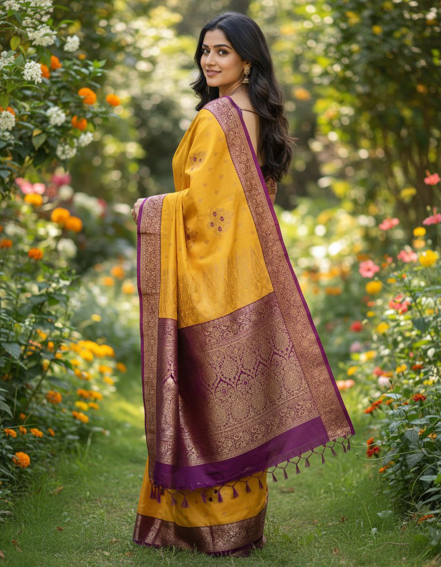 Brighten any occasion with this stunning Mustard Yellow Traditional Saree, a perfect blend of vibrant color and classic elegance. The rich mustard body features delicate self-weave patterns that add a subtle texture and depth to the fabric. It is beautifully contrasted by a majestic wine-purple border and pallu, which are intricately woven with traditional floral and circular zari motifs in a shimmering gold finish.