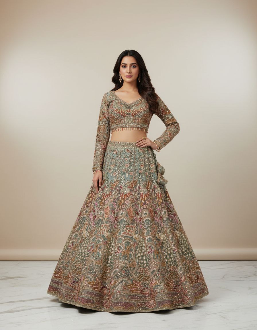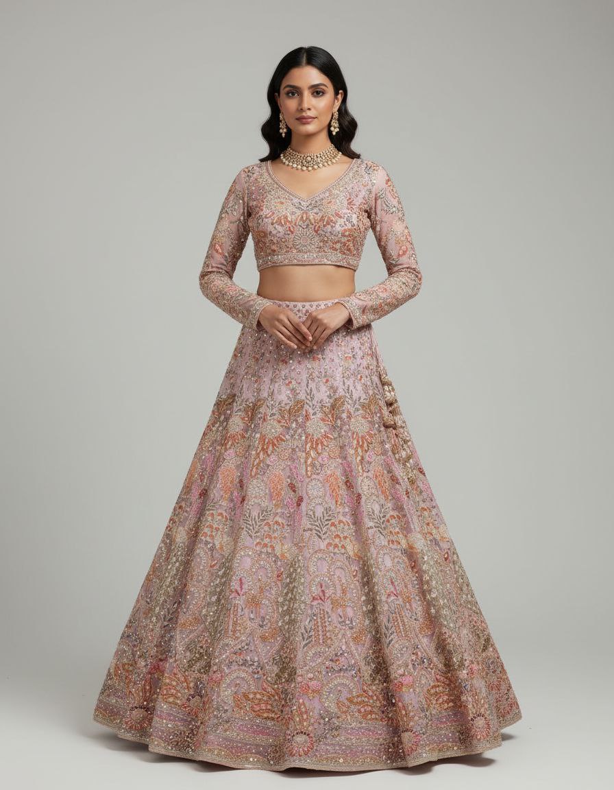 | Work | Dense Gold/Bronze Sequin and Bead work on the choli. Pleated texture on the lehenga. |