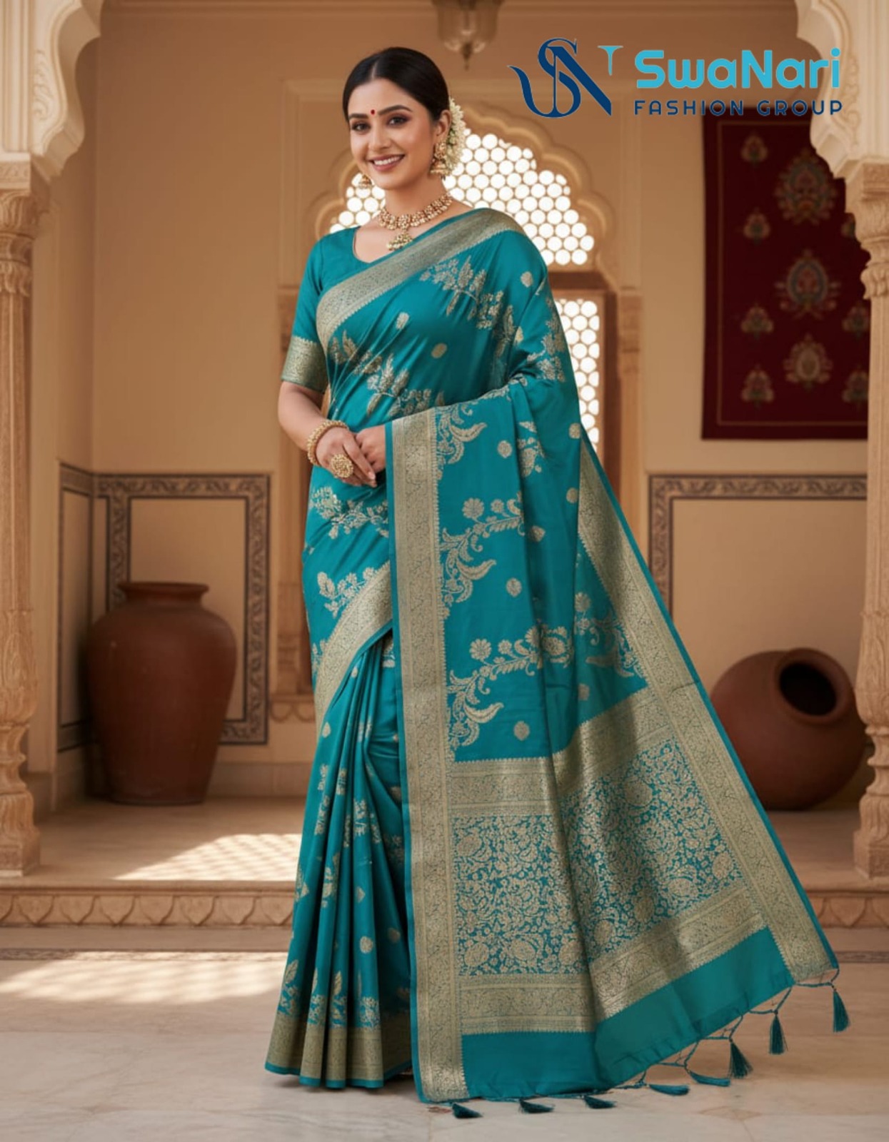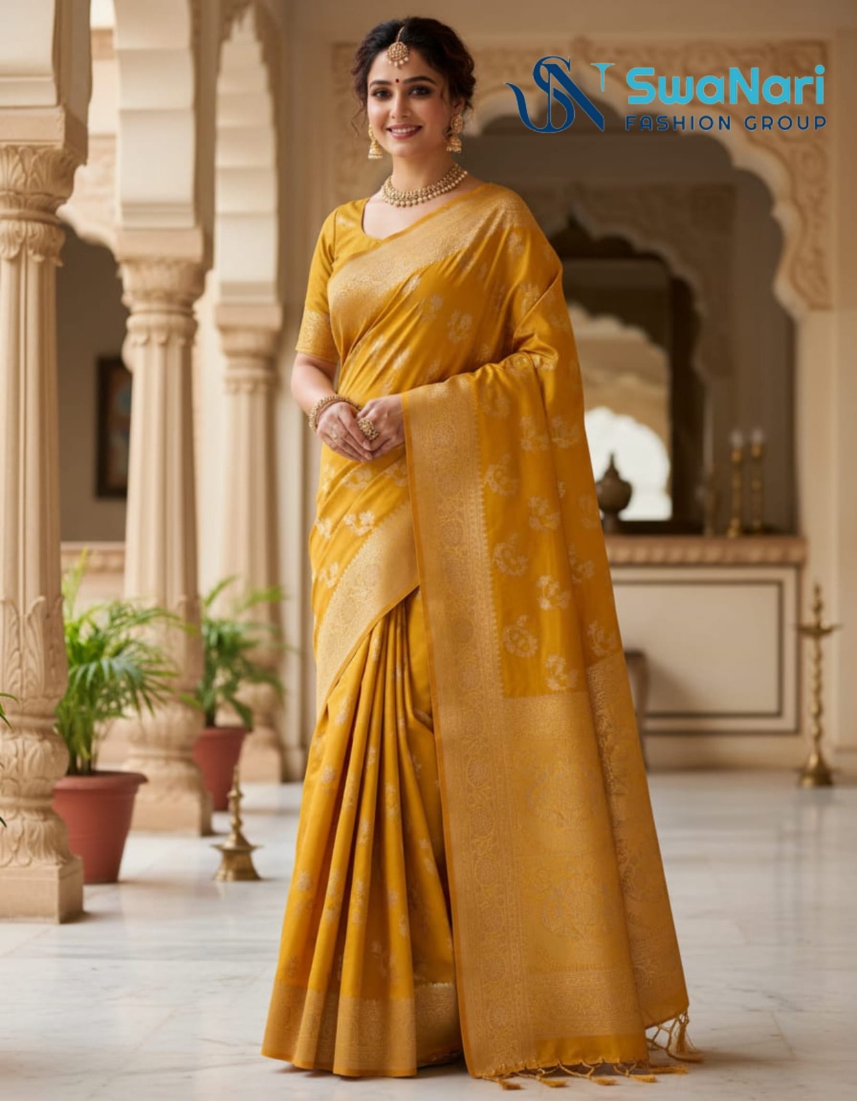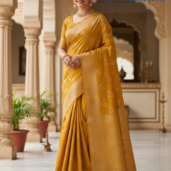 This luxurious saree is the quintessential choice for weddings, grand festivals, and traditional ceremonies like Haldi.