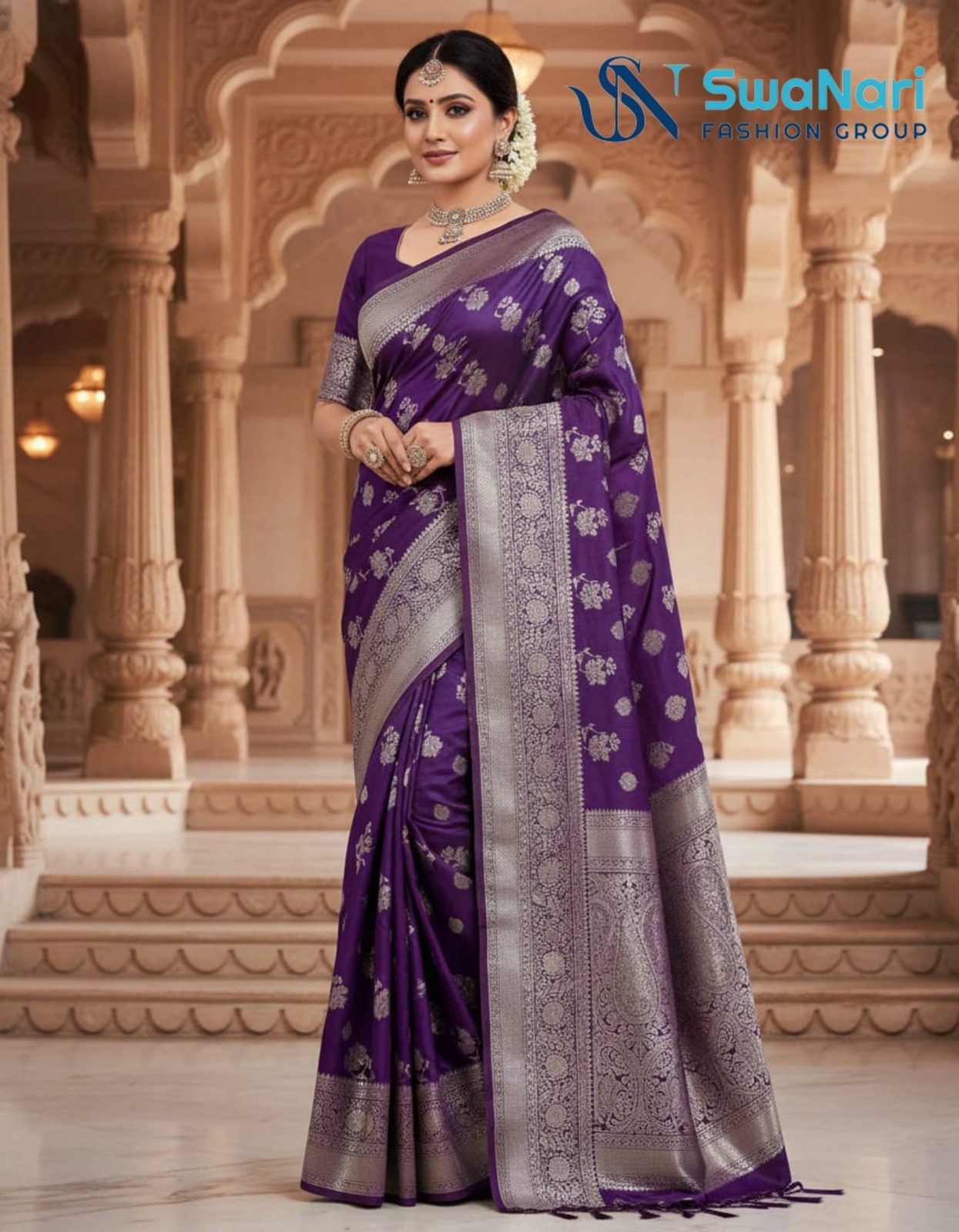 | Style Tips: | Pair with heavy traditional gold jewelry (temple jewelry, elaborate necklaces). Drape gracefully to showcase the heavy zari pallu. Style with gajra/fresh flowers for a classic festive look. |