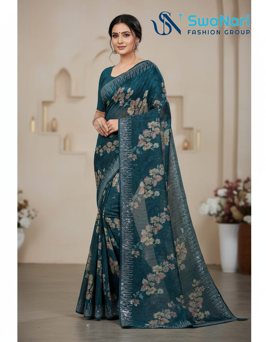 | Saree Pattern: | Digital Floral Print with Embellished Border (Sequin/Stonework Bands) |