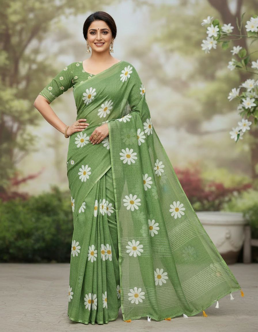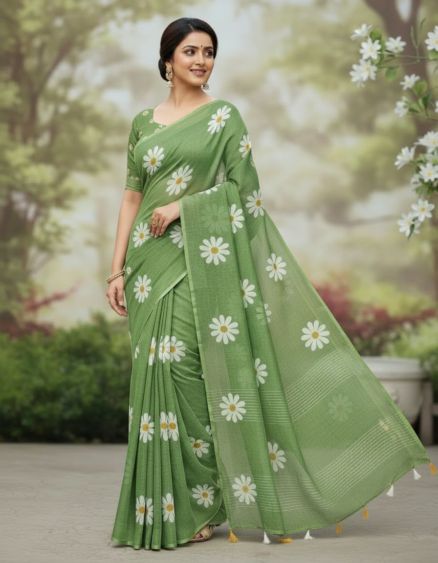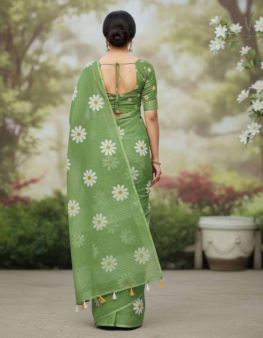 Experience the perfect blend of refreshing color and timeless elegance with the Leaf Green Floral Saree with Zari Accents from Swanari Fashion’s “Bloom & Grace” collection. This stunning pistachio green saree is crafted from a soft cotton-silk or lightweight Chanderi blend, ensuring a fluid drape and day-long comfort for any occasion. The body of the saree is adorned with vibrant white daisy motifs featuring cheery yellow centers, creating a serene and garden-fresh aesthetic. Adding a touch of traditional sophistication, the pallu features delicate horizontal Zari stripes that catch the light beautifully. Accompanied by a 0.8-meter matching blouse piece decorated with a dainty all-over micro-floral sprig print, this 5.5-meter saree offers a cohesive and polished look. Ideal for daytime festivities, garden weddings, casual socials, or even refined workwear, this ensemble is both versatile and stylish. To maintain its exquisite quality, a gentle hand wash or dry clean is recommended, followed by a medium-heat iron on the reverse side. Elevate your ethnic wardrobe with this breathable, trend-focused piece that captures the essence of spring-summer fashion while honoring the rich craftsmanship of Surat, Gujarat.