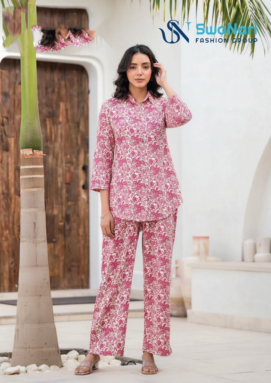 Relax in style with this charming Lilac Floral Printed Co-ord Set from the SwaNari Fashion Group. This two-piece ensemble is designed for comfort without compromising on contemporary fashion. The set features a straight-fit top and matching trousers, both adorned with a dense, delicate floral print in shades of lilac, purple, and green against a light background. The top has a sophisticated V-neckline with a partial placket and is cinched at the waist with an attached self-fabric tie-up belt, allowing for an adjustable and flattering fit. It is finished with comfortable 3/4 Sleeves. The matching straight-fit trousers continue the print, completing the coordinated look. Crafted from a soft, lightweight fabric, this set is ideal for lounging at home, casual errands, or as comfortable travel wear. It’s a perfect blend of modern style and relaxed comfort.