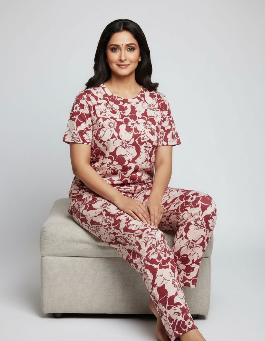 Indulge in feminine charm with this enchanting Maroon and Cream Floral Kurta Set from the SwaNari Fashion Group. This exquisite ensemble features a gorgeous A-line/Anarkali-style kurta with a lively, all-over floral print in rich maroon against a creamy white base. The vibrant, bold blossoms make a captivating statement. The kurta is designed with a sophisticated Band Collar and a full-length placket, maintaining a clean and elegant neckline. It features comfortable Short Sleeves, making it an excellent choice for warmer days. The flattering flare of the kurta’s A-line silhouette is complemented by straight-fit trousers that continue the matching floral print for a complete, coordinated look. Crafted from a soft, flowing fabric (likely rayon or cotton blend), this set offers both comfort and a dreamy aesthetic. It’s the perfect choice for garden parties, casual day events, or elegant ethnic wear.