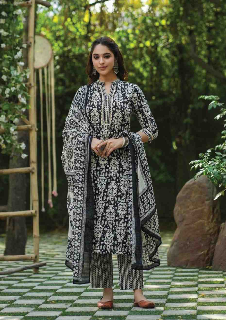 Midnight Bloom: Hand-Block Inspired Kurta, Pant & Dupatta Set
