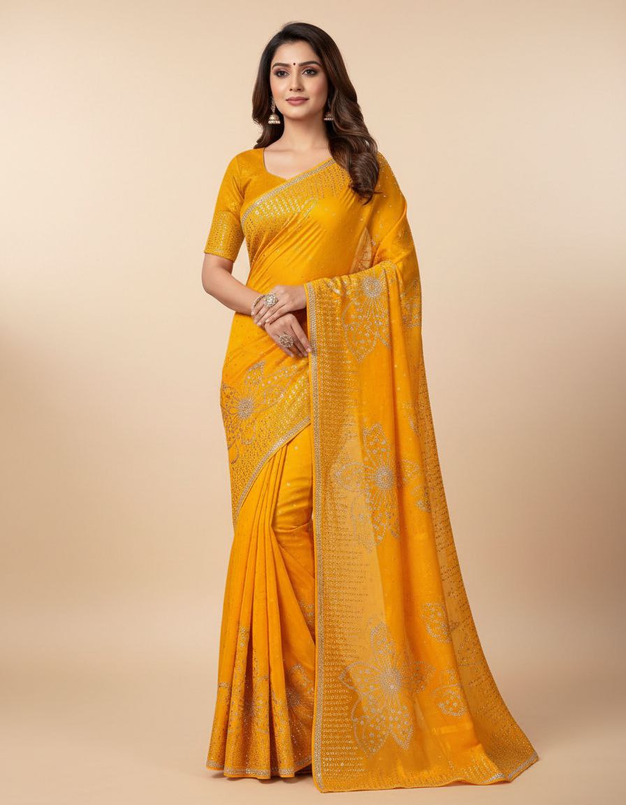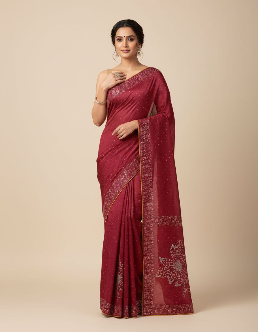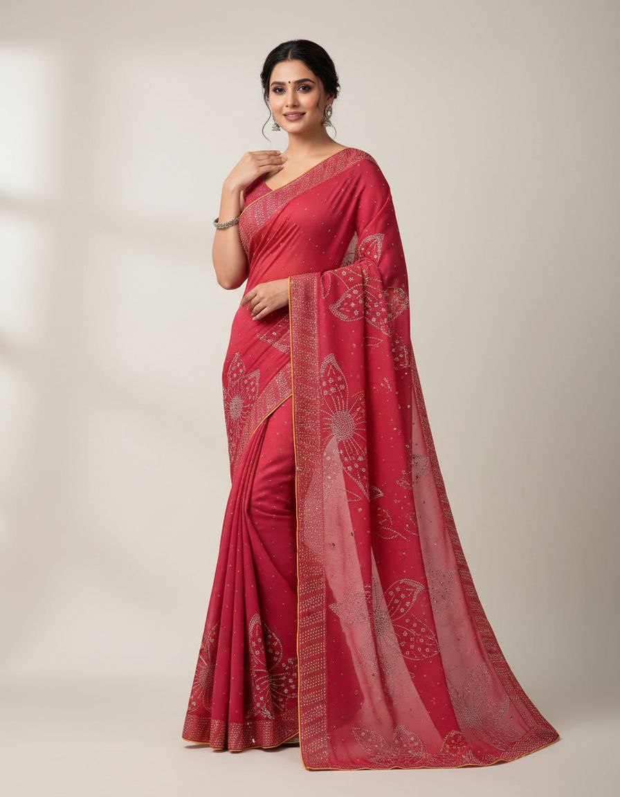 | Saree Pattern: | Scattered Stone Dots and Elaborate Floral Motifs on Border |