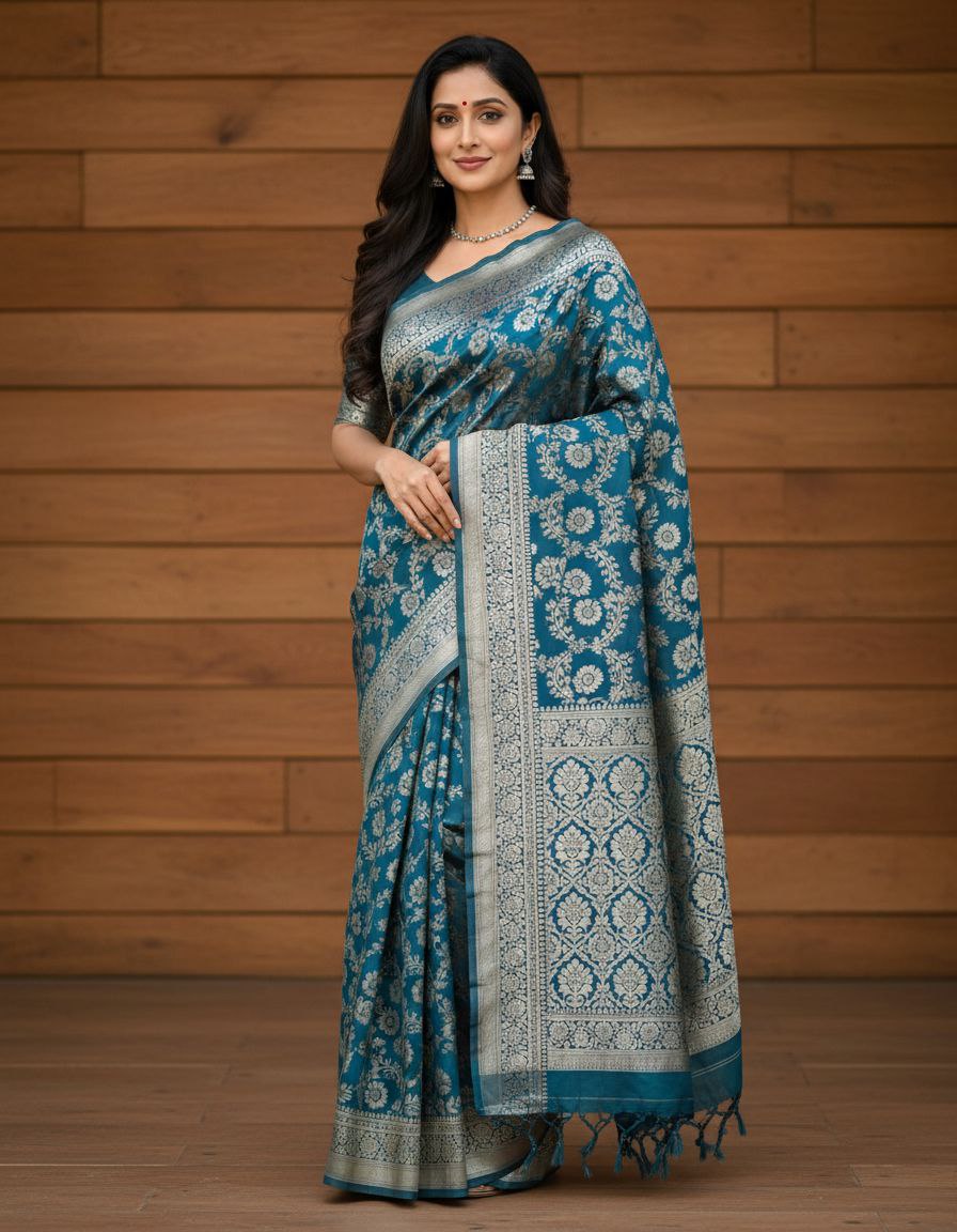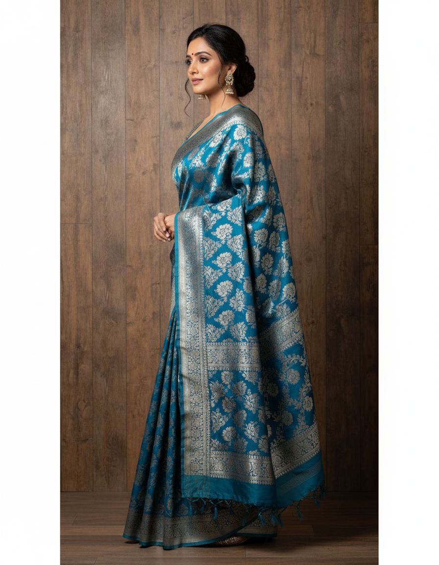 Indulge in the sheer opulence of this Midnight Sapphire Silk Saree, a stunning tribute to classical weaving traditions. This ensemble features a deep, lustrous navy blue base that serves as a dramatic canvas for an all-over intricate gold zari floral vine pattern. The meticulous craftsmanship is further highlighted by a broad, majestic border adorned with detailed floral and leaf motifs, leading to a grandly decorated pallu finished with delicate hand-knotted tassels.