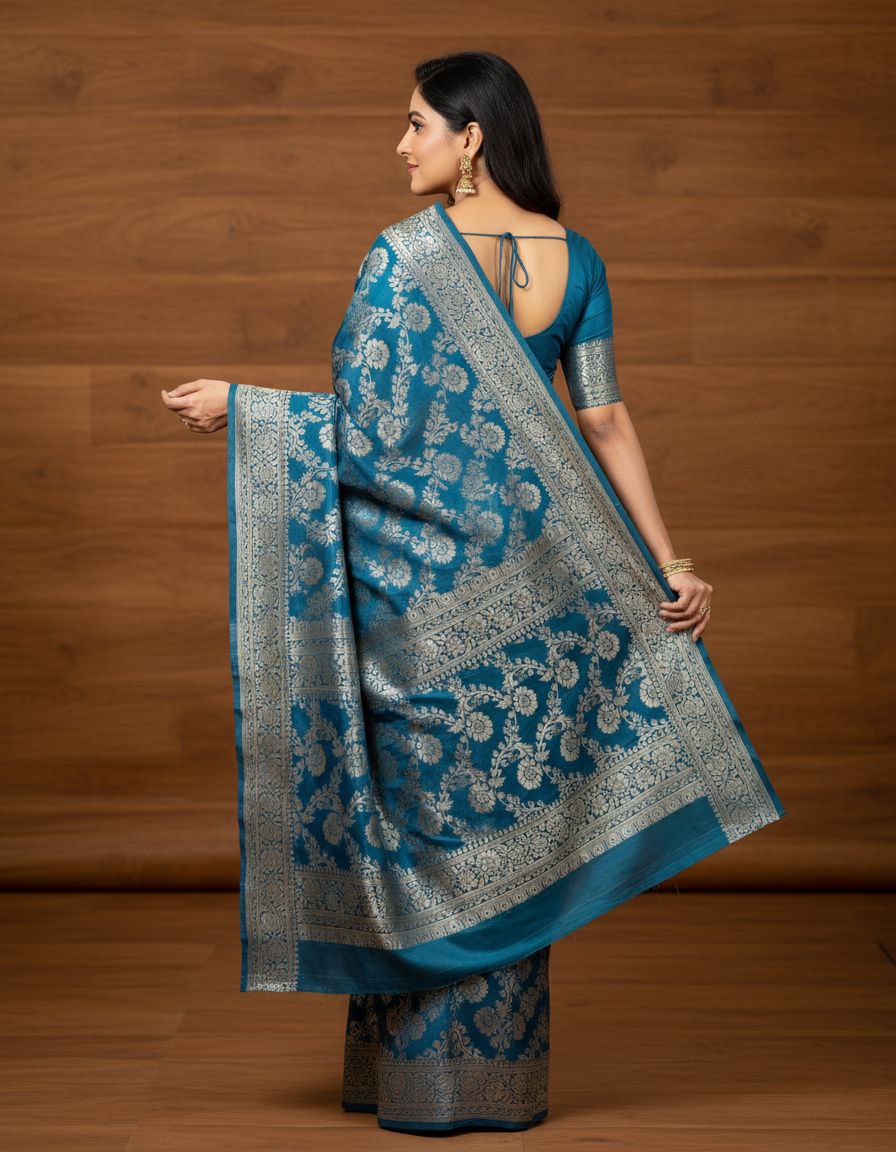 Midnight Sapphire: Golden Floral Heritage Silk Saree