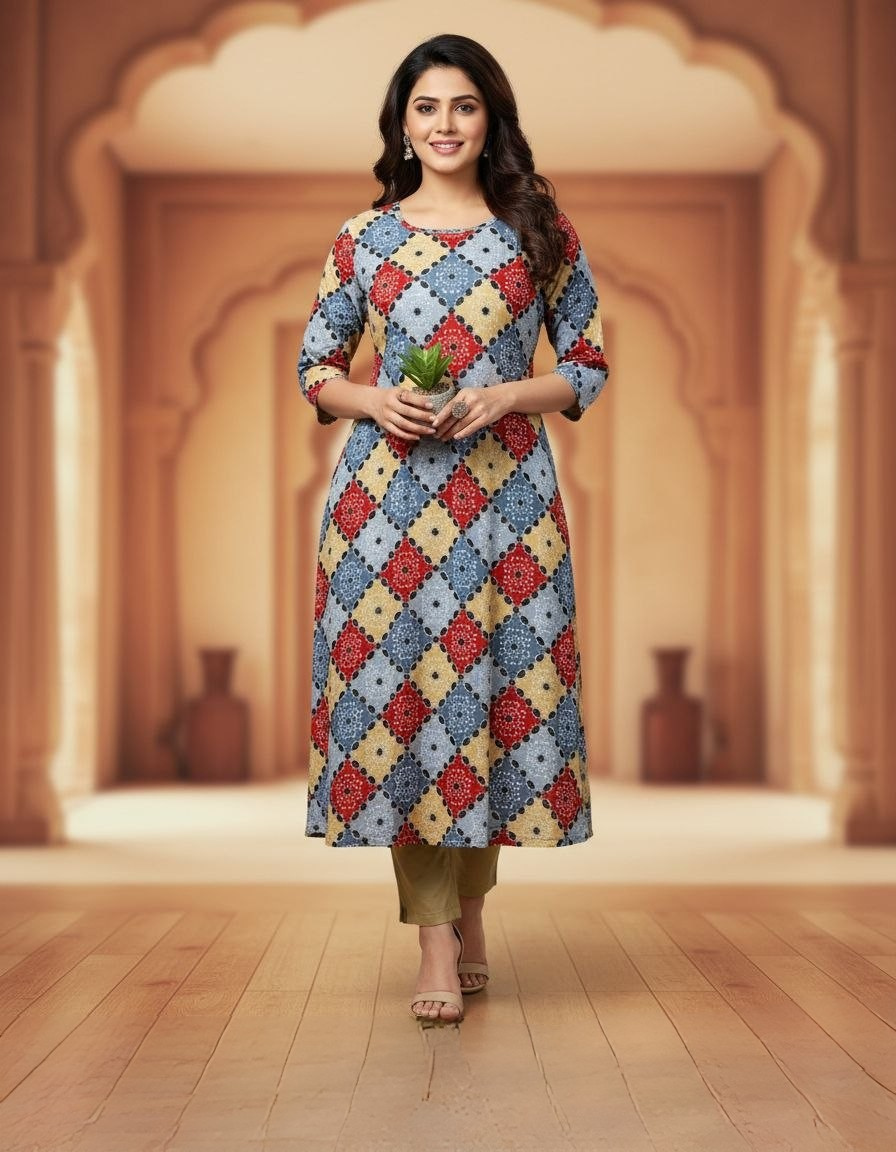 Infuse your wardrobe with a burst of artistic energy with our Multicolor Geometric Diamond Print Kurta. This piece is a modern tribute to traditional mosaic patterns, featuring a vibrant play of earthy red, mustard yellow, and slate blue. The intricate diamond-grid pattern is accented with delicate floral-style detailing inside each segment, creating a rich, textured visual that stands out without being overwhelming.