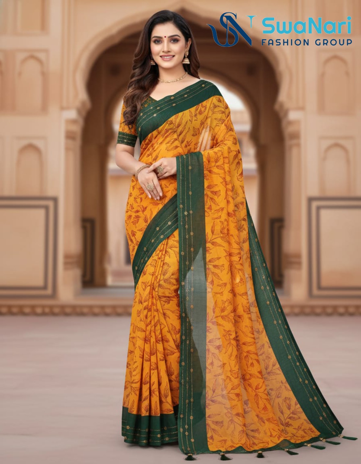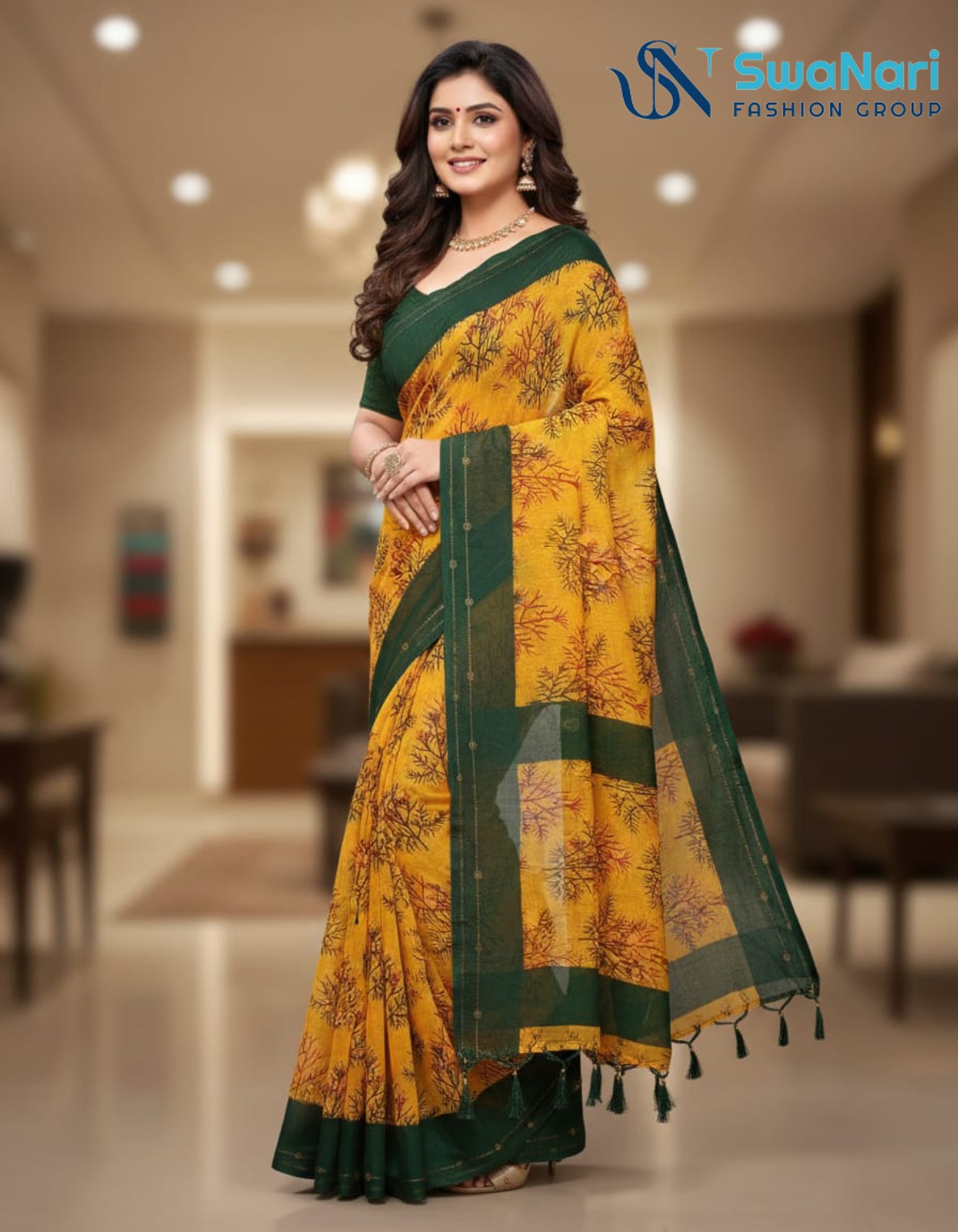 This effortlessly chic saree is crafted from a soft, lightweight Zomato fabric (as per product details) or similar Art Silk blend, offering comfortable wear and a graceful, free-flowing drape. The vibrant Mustard Yellow base is beautifully adorned with a dense digital tree or branch print in darker tones. The look is completed by a rich, contrasting Dark Green border and pallu, often featuring tassel detailing. This versatile, contemporary piece is perfect for daytime festive celebrations, casual outings, or semi-formal events, offering a modern silhouette with a vibrant, nature-inspired print.