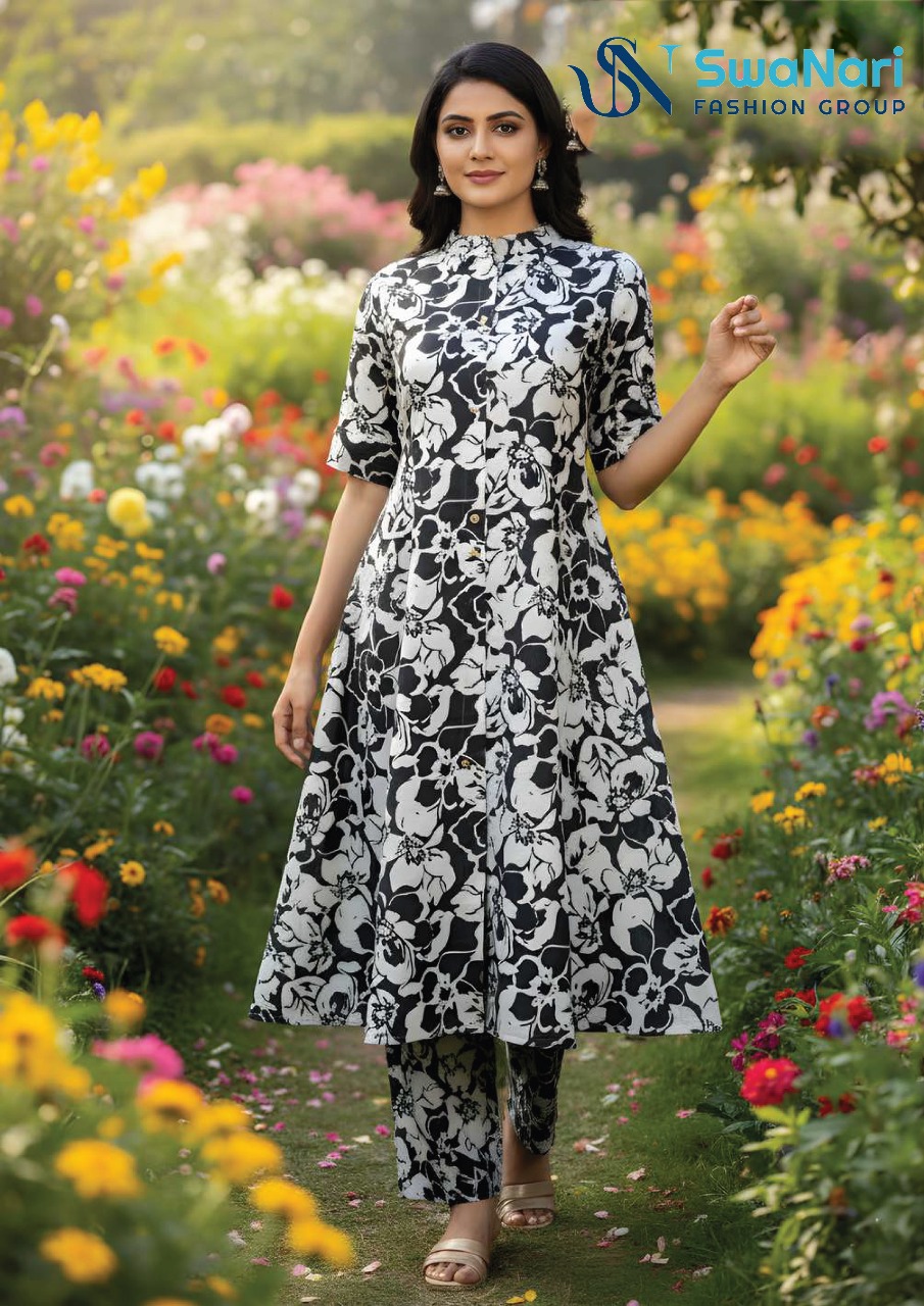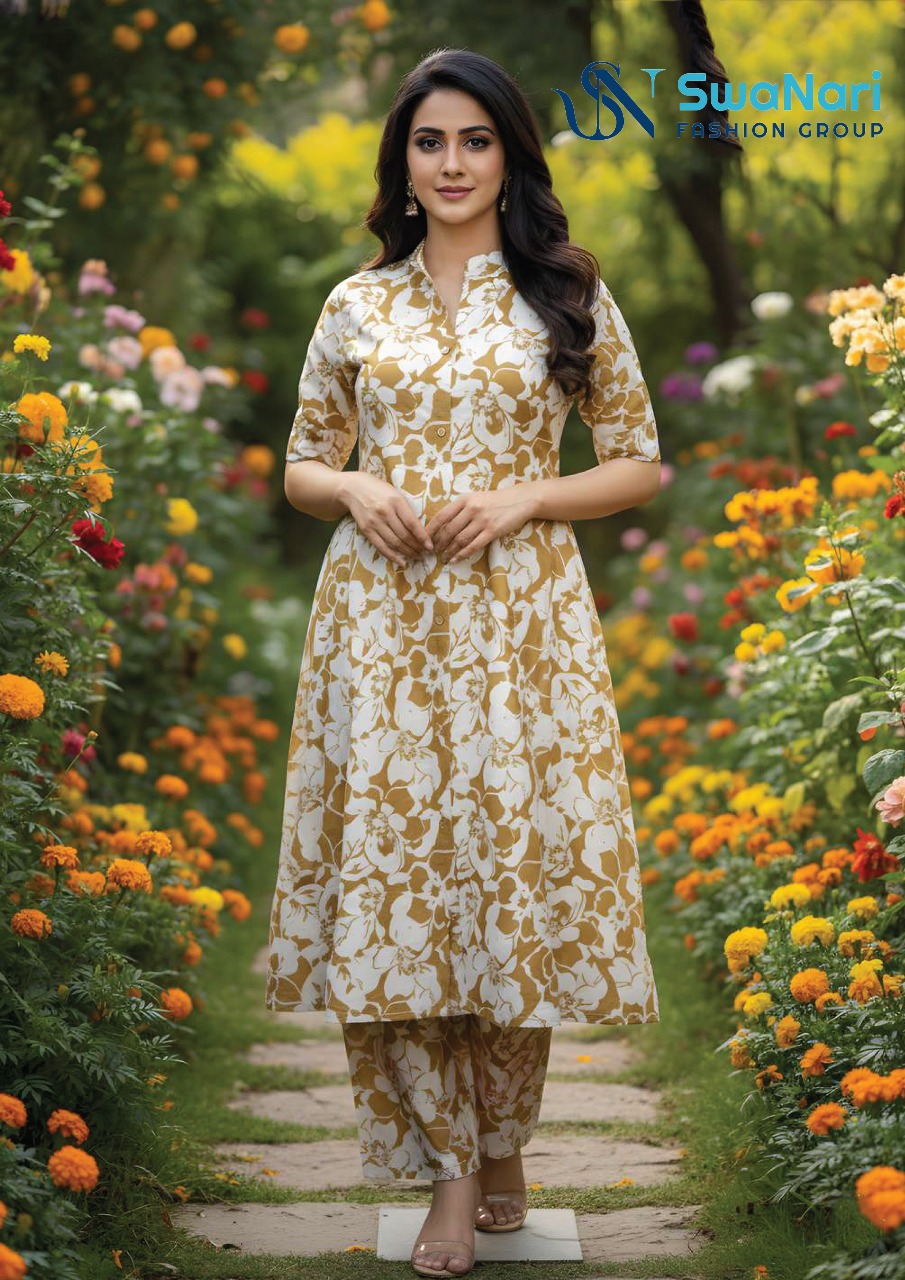Embrace serene elegance with this charming Mustard Yellow and White Floral Kurta Set from the SwaNari Fashion Group. This beautiful ensemble features a flowy, A-line kurta adorned with a large, all-over floral print in a soothing mustard yellow and white color palette, perfectly suited for daytime events. The kurta is designed with a chic Mandarin Collar and a simple neckline, maintaining a clean, sophisticated look. It features comfortable Short Sleeves, making it an ideal choice for warmer weather. The flattering flare of the kurta’s A-line silhouette is complemented by straight-fit trousers that continue the matching floral print for a cohesive, coordinated finish. Crafted from a soft, breathable fabric (likely cotton or rayon), this set offers superior comfort and a dreamy aesthetic. It’s the perfect choice for garden parties, casual day outings, or office wear where a touch of refined ethnicity is desired.