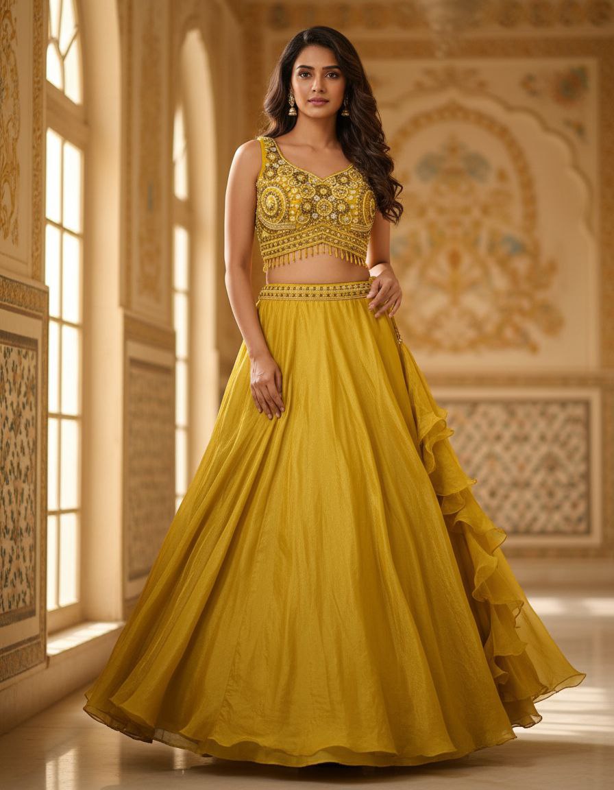 | Lehenga | Fabric: Art Silk, Tissue Silk, or Georgette. Design: Floor-length skirt in a vibrant Mustard Yellow color, featuring cascading ruffles running vertically down one side, adding drama and movement. |