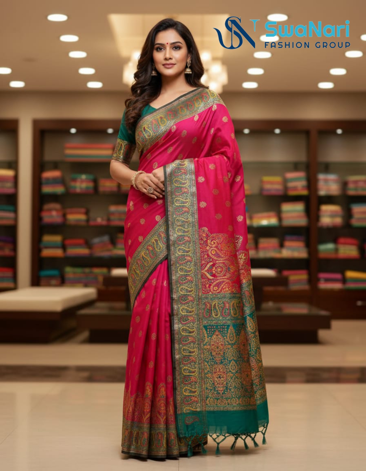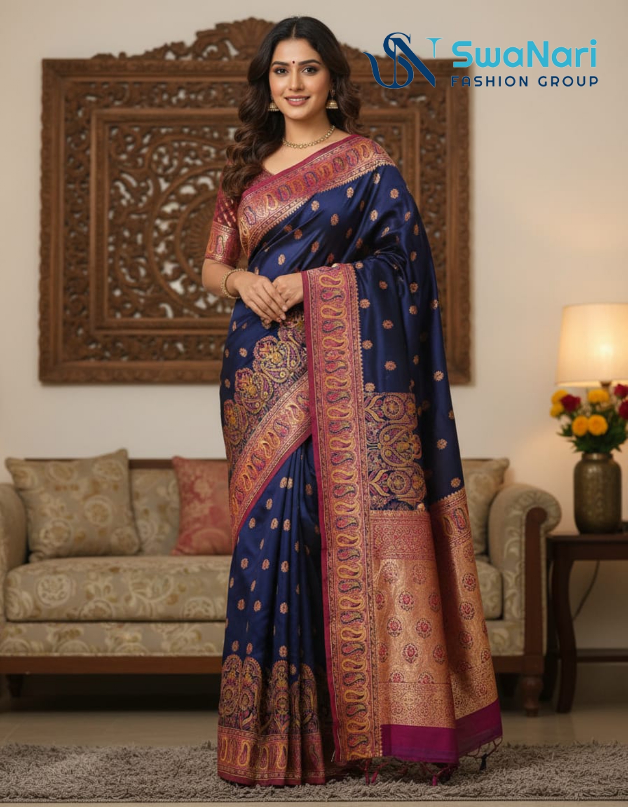 | Blouse Color: | Indigo Blue / Navy Blue (Matching Saree Base – Inferred from image) |