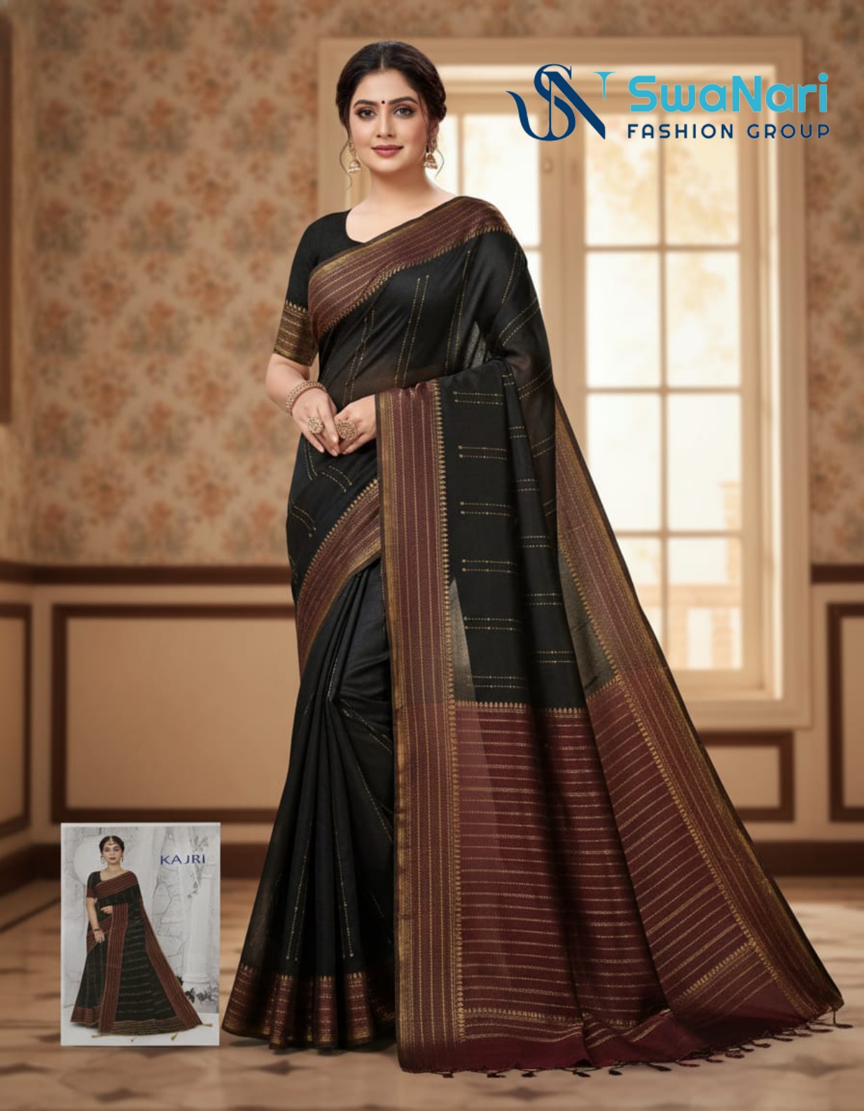 Embrace sophisticated casual style with this flowing saree from the SwaNari Fashion Group. Crafted from a lightweight Georgette or Cotton Blend fabric, this saree is comfortable for all-day wear. The deep Indigo/Navy Blue base is beautifully contrasted with a vibrant digital floral print featuring white, cream, and soft green blooms. The border and pallu incorporate subtle stripe patterns, adding a contemporary touch. This versatile garment is ideal for casual outings, daytime events, office wear, or sophisticated social gatherings.