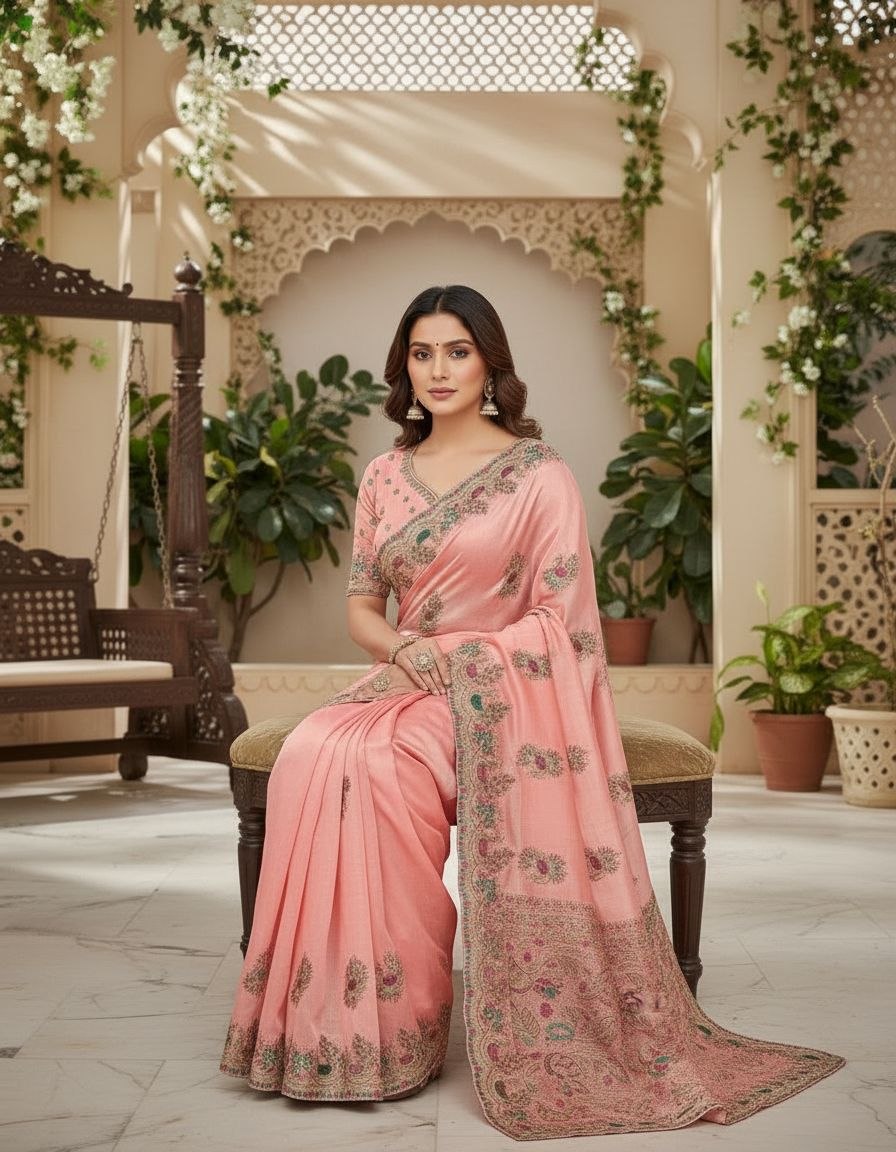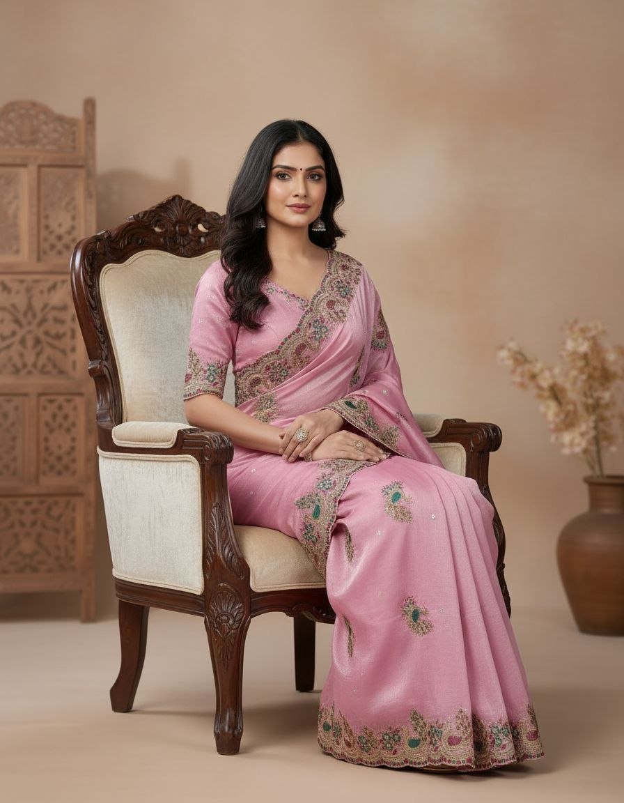 The hallmark of this collection is the extensive multi-color threadwork and sequin embroidery. A majestic floral border runs the length of the saree, featuring intricate paisley motifs filled with vibrant pink, emerald, and gold accents. The body is elegantly peppered with embroidered buttis, leading to a grand pallu finished with handcrafted tassels. Accompanied by a heavy designer blouse piece that mirrors the saree’s intricate borders, this ensemble is an heirloom-quality choice for weddings, receptions, and high-fashion festive events.