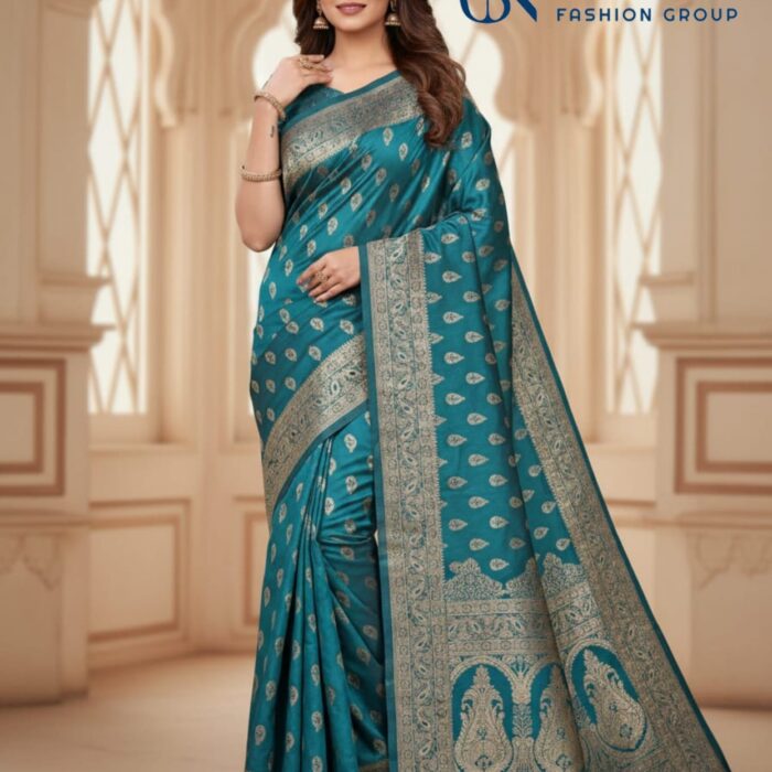 Woven from a lustrous, high-quality Art Silk/Blended Silk, this saree offers an impeccable traditional drape in a rich Peacock Teal hue. The body features intricate silver/antique gold woven paisley motifs (butis), adding classic depth and shimmer. The design is perfected by an exceptionally broad and heavy zari border and pallu, showcasing complex traditional patterns that provide a striking, regal contrast. This magnificent saree is the ultimate choice for weddings, grand festivals, and formal traditional celebrations, making a sophisticated and dramatic statement.