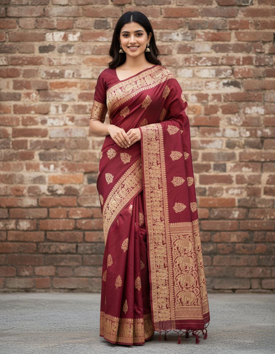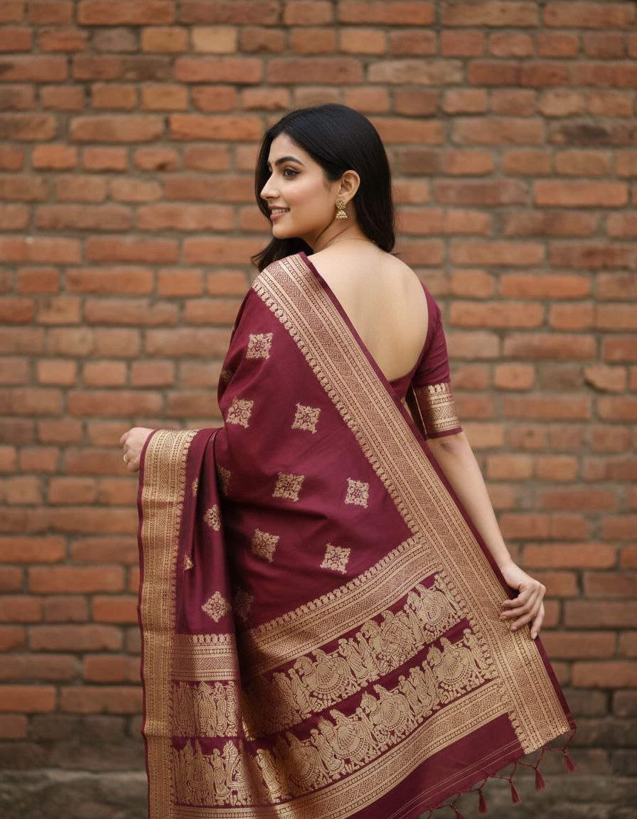 Embrace the delicate charm of spring with this stunning Peach Blossom Silk Saree. This ensemble features a soft, warm peach base that radiates a natural, youthful glow. The body is elegantly adorned with an all-over print of intricate marquise-style floral motifs in a deep wine-red hue, creating a striking contrast that is both sophisticated and romantic.
