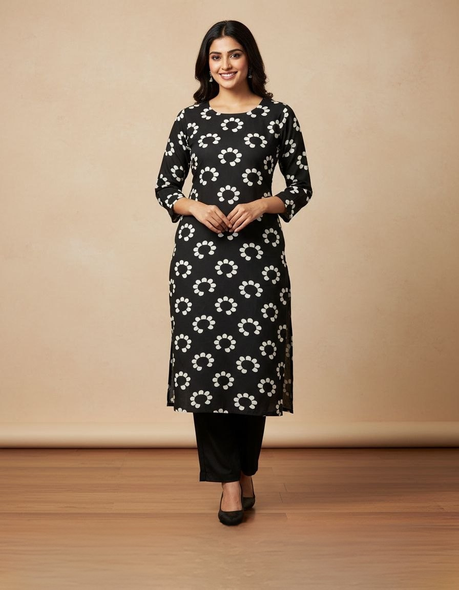 Redefine your daily wardrobe with this sophisticated Monochrome Floral Straight Kurta. Perfectly balancing traditional silhouettes with a contemporary aesthetic, this piece features a striking contrast of bold white floral motifs against a deep black canvas. The design draws inspiration from minimalist art, offering a “retro-modern” vibe that works seamlessly from office hours to evening gatherings.