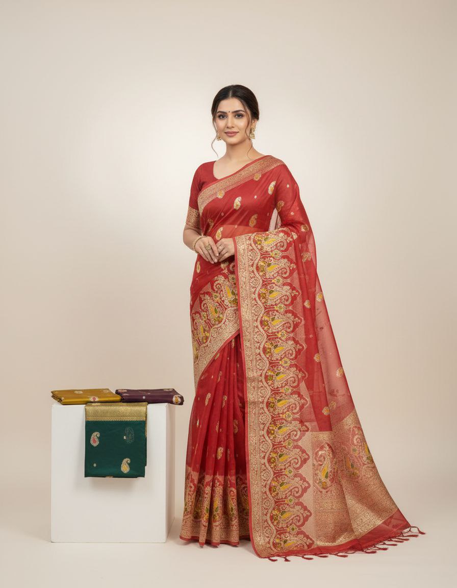 This absolutely stunning saree features a vibrant, deep red color in a semi-sheer, structured fabric, likely a Tussar or Art Silk blend. The highlight is the exceptionally ornate gold zari brocade border, which is wide and features large, intricate paisley (mango) motifs in rich colors like yellow, pink, and red. The body of the saree has subtle woven texture and minimal embellishment, allowing the detailed border to take center stage. It is paired with a matching solid red blouse with short sleeves and a subtle woven pattern on the cuff. This is a regal, statement piece, perfectly suited for weddings, grand festive occasions, and traditional ceremonies.
