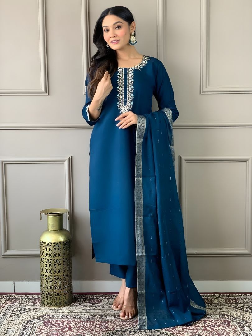 Step into the spotlight with this breathtaking teal blue ethnic ensemble, a perfect harmony of classical charm and contemporary flair. This three-piece set is meticulously crafted for the woman who desires a sophisticated yet vibrant look for festive celebrations, weddings, or high-end social gatherings. The kurta is tailored from premium silk, offering a rich, smooth texture and a subtle natural luster that enhances the deep teal hue. The neckline and sleeves are the highlights of the garment, featuring intricate floral thread work in white and turquoise, accented with delicate silver zari that adds a regal touch.