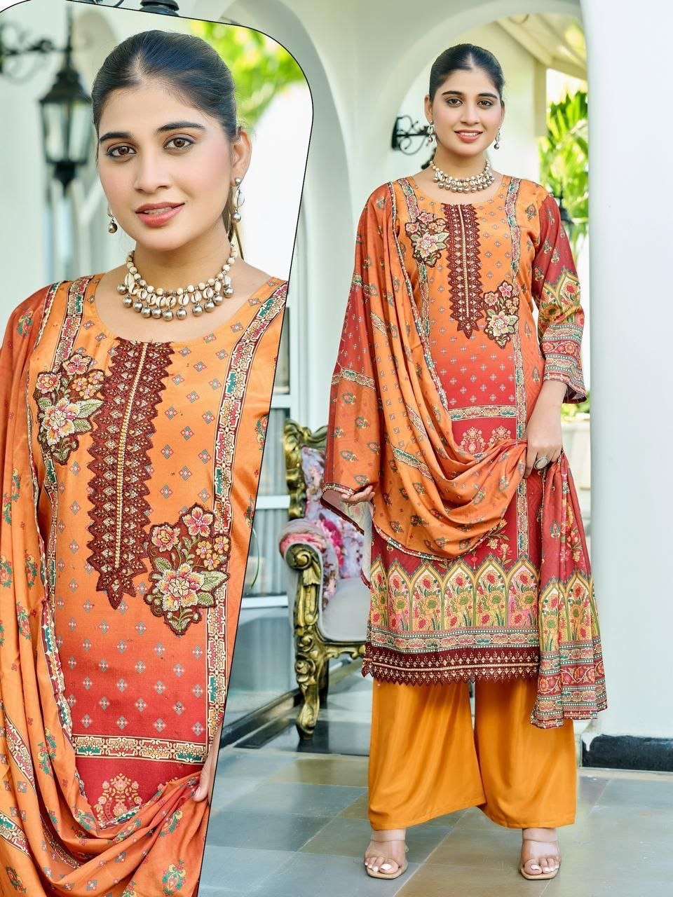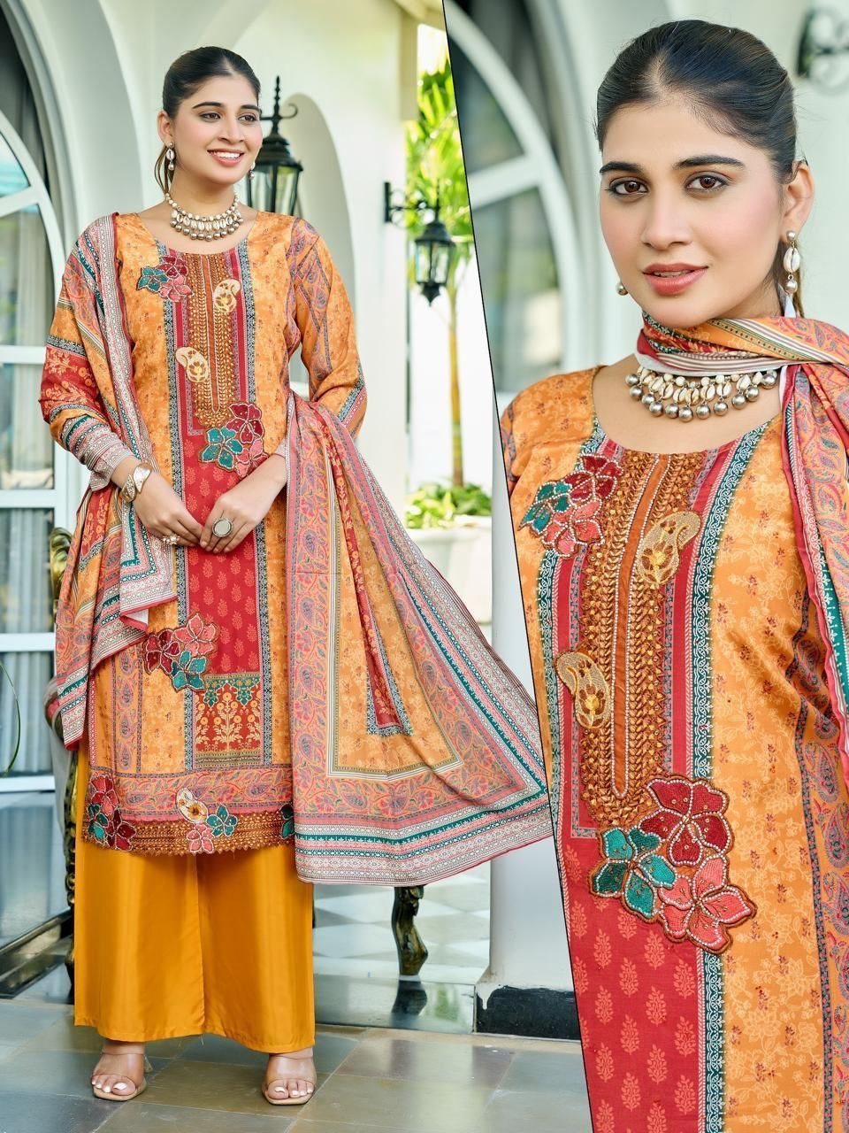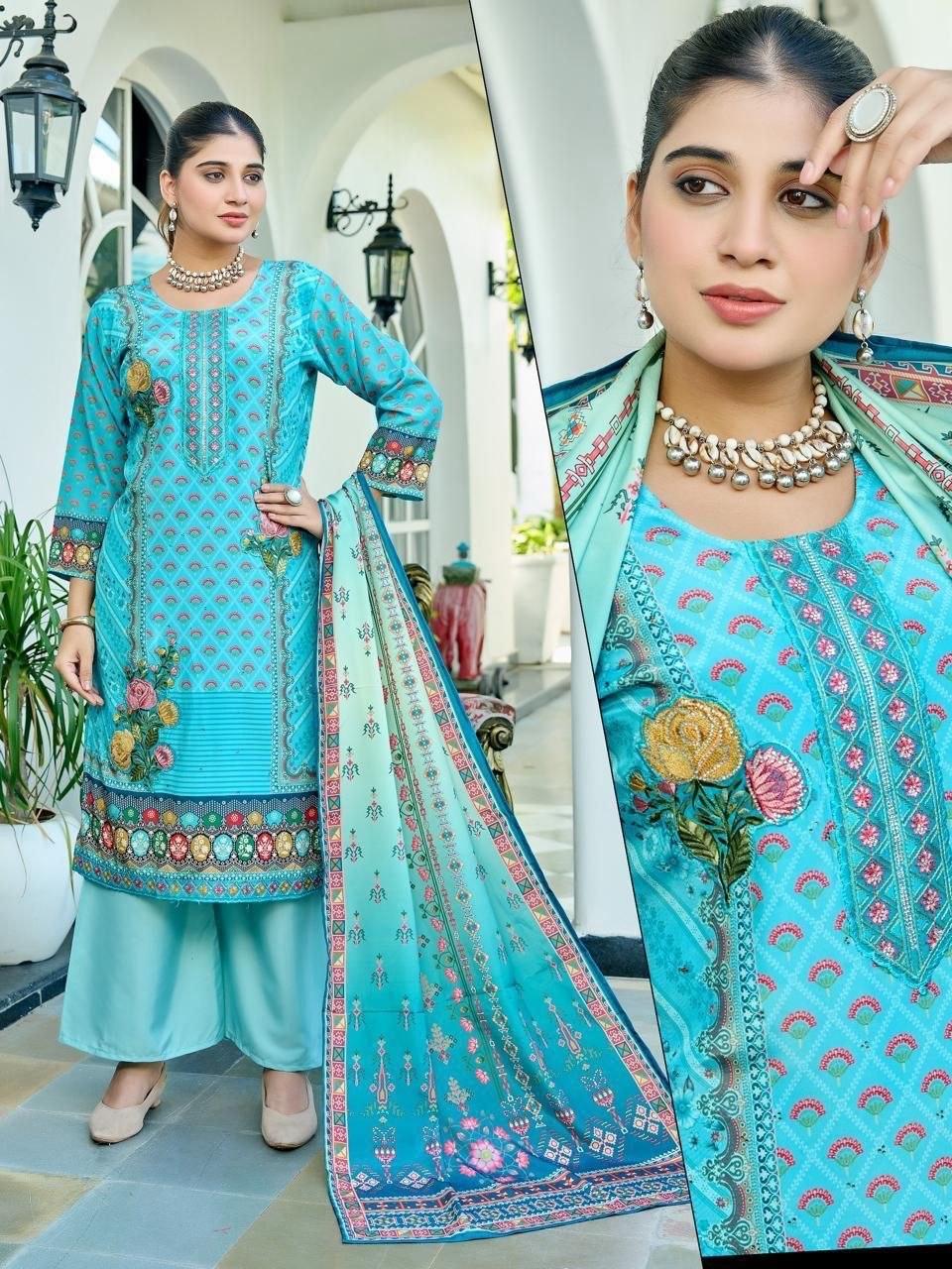 | Neckline | Elegant Round Neck with Intricate Floral Yoke |