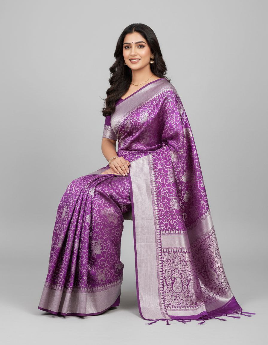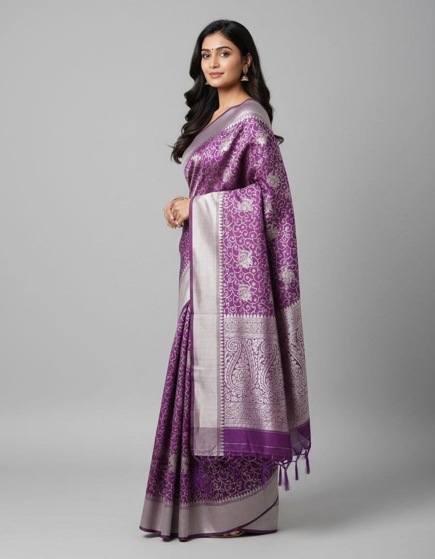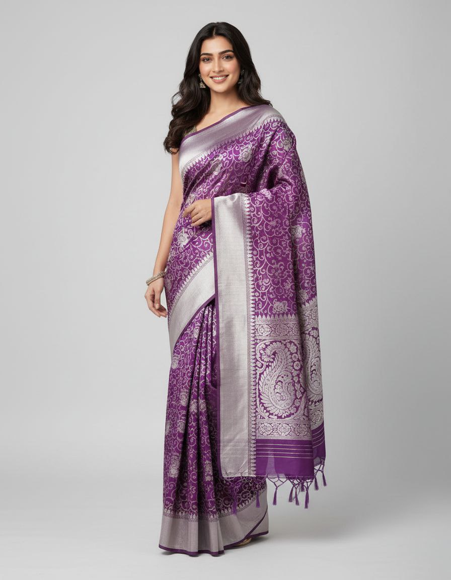 Elevate your festive wardrobe with this majestic Royal Purple Silk Saree from Swanari Fashion. A true testament to traditional Indian craftsmanship, this saree is draped in a rich, regal purple hue and adorned with intricate silver zari floral jaal work that covers the entire body. The design is framed by wide, lustrous silver borders featuring classic paisley and geometric motifs, while the heavily decorated pallu with delicate tassels adds a grand, high-fashion finish.