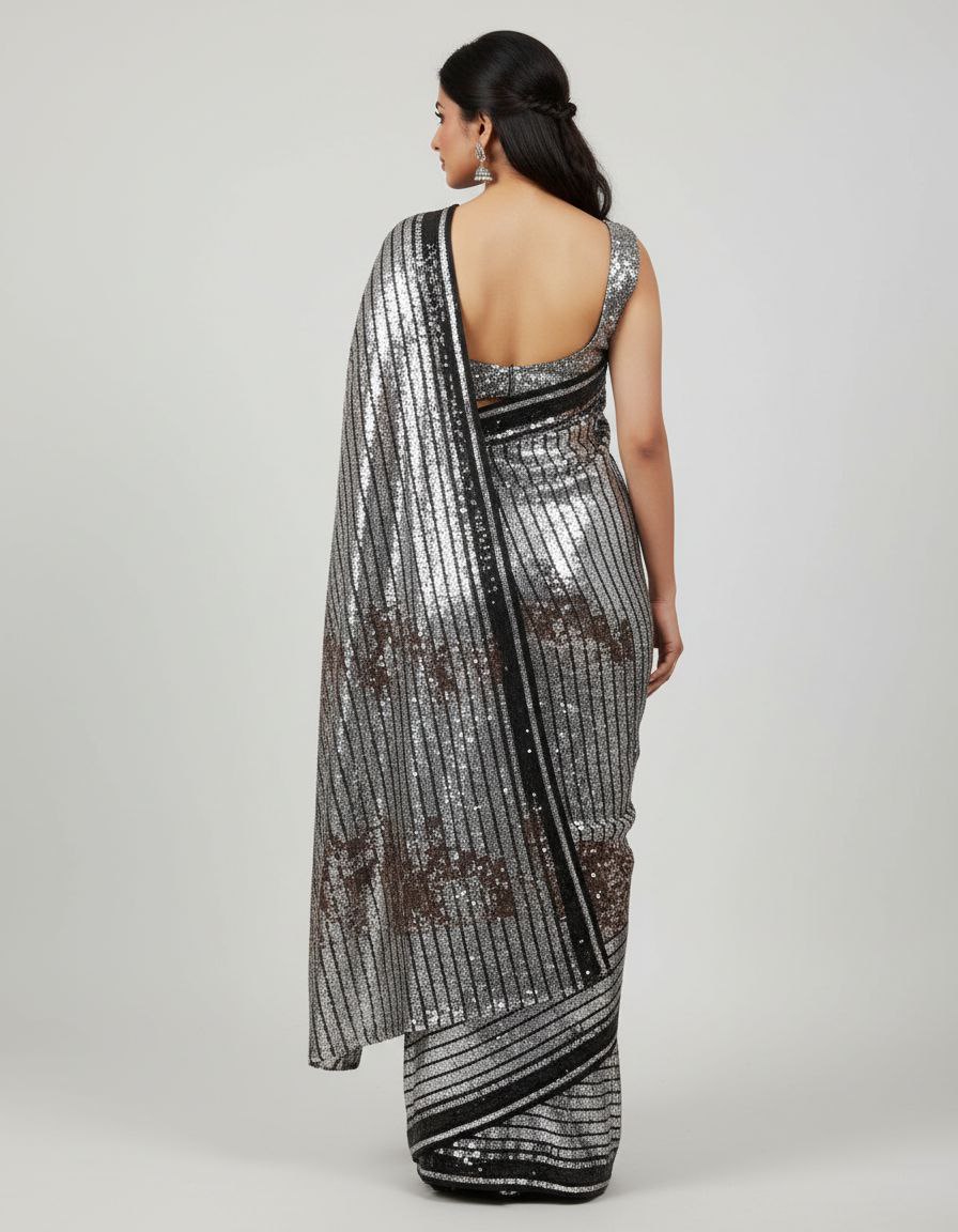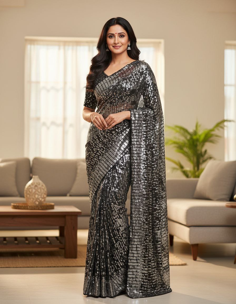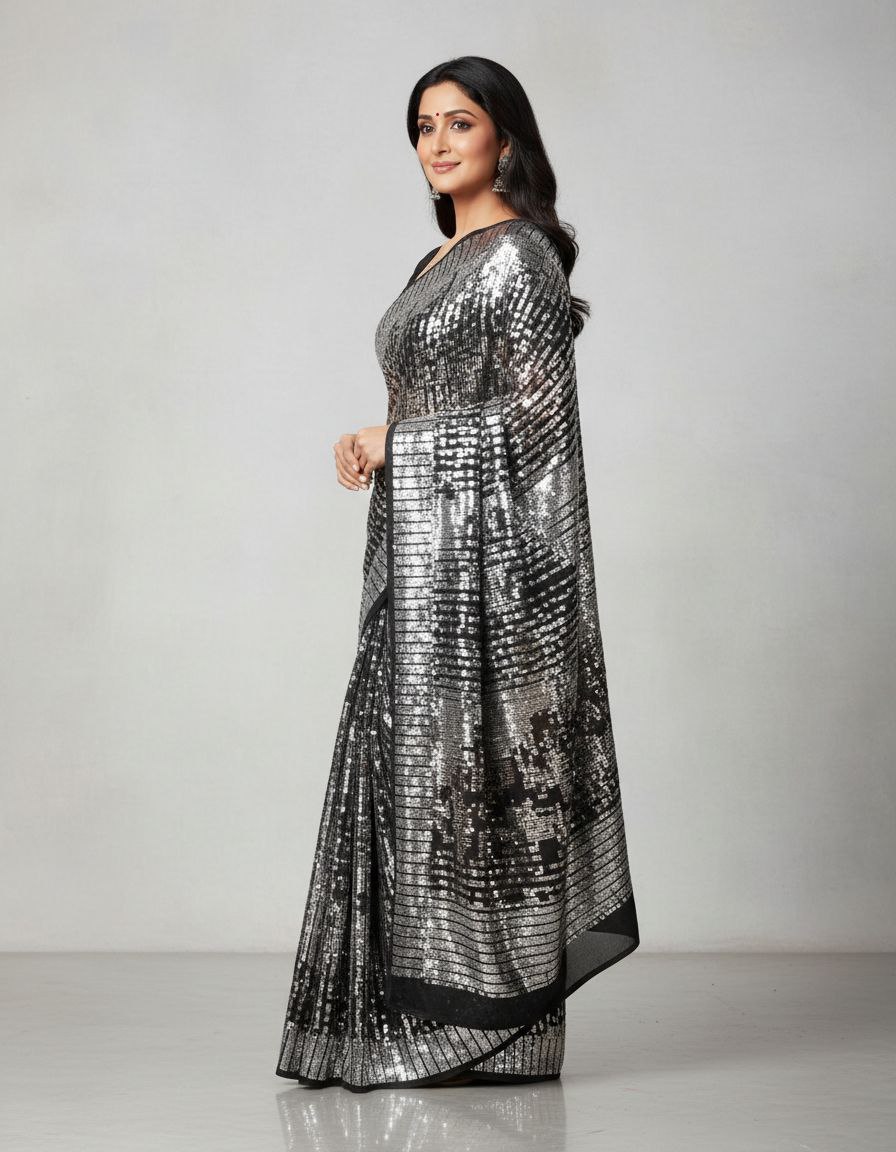 The look is complemented by a matching blouse featuring intricate all-over sequin work that adds just the right amount of sparkle for a daytime event. This piece is perfect for those who seek elegance in simplicity, making it an ideal choice for pre-wedding functions, garden parties, or festive brunches. The lightweight fabric allows for a breezy, comfortable fit that moves beautifully with you. Experience the perfect harmony of texture and tradition with this refreshing addition to your ethnic collection.