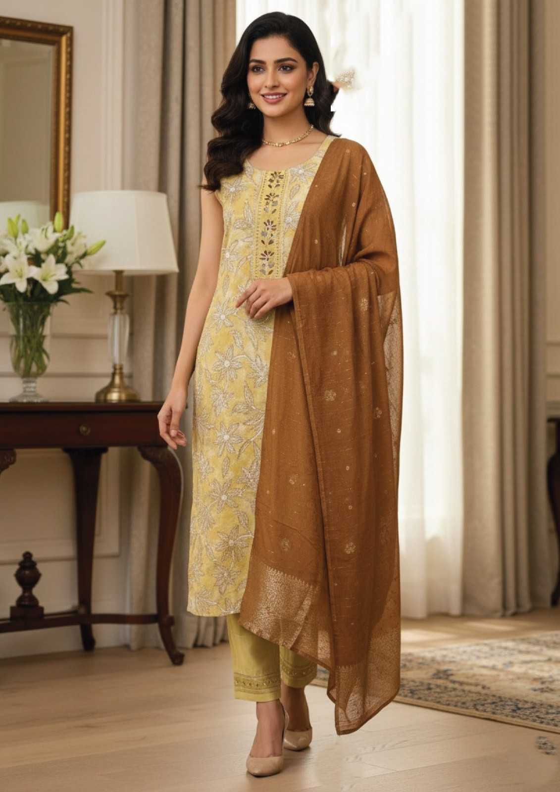 Radiate warmth and traditional charm with this elegant three-piece ethnic ensemble. The set features a sleeveless, straight-cut kurta in a bright ochre yellow, adorned with a delicate all-over silver floral self-print. A central embroidered panel with intricate deep-brown floral threadwork provides a sophisticated focal point at the round neckline. Completing the look is a rich, earth-toned brown dupatta crafted from a translucent fabric with subtle self-textured patterns and a shimmering border. This ensemble beautifully balances vibrant seasonal colors with classic artisanal details, making it an ideal choice for daytime festivities or semi-formal celebrations.